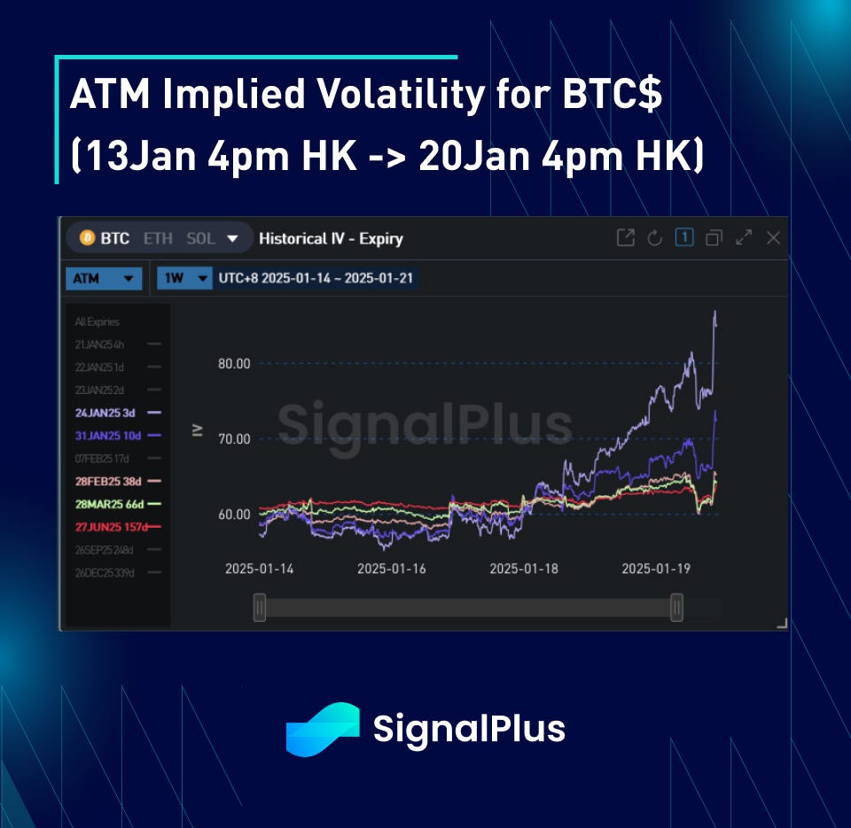 · Skew prices were generally better bid for calls this week as spot rejected the flush below $90k and reclaimed $100k. The most noticeable demand for topside was in gamma expiries covering the inauguration given the potential upside tail of strategic reserve announcement/executive order. However, further out the curves, the skew price action was more muted with the market not looking to roll up existing call spreads or add to outright topside, which suggests the market is already heavily deployed from December flows and looking for a break towards $120k to actually roll up existing structures