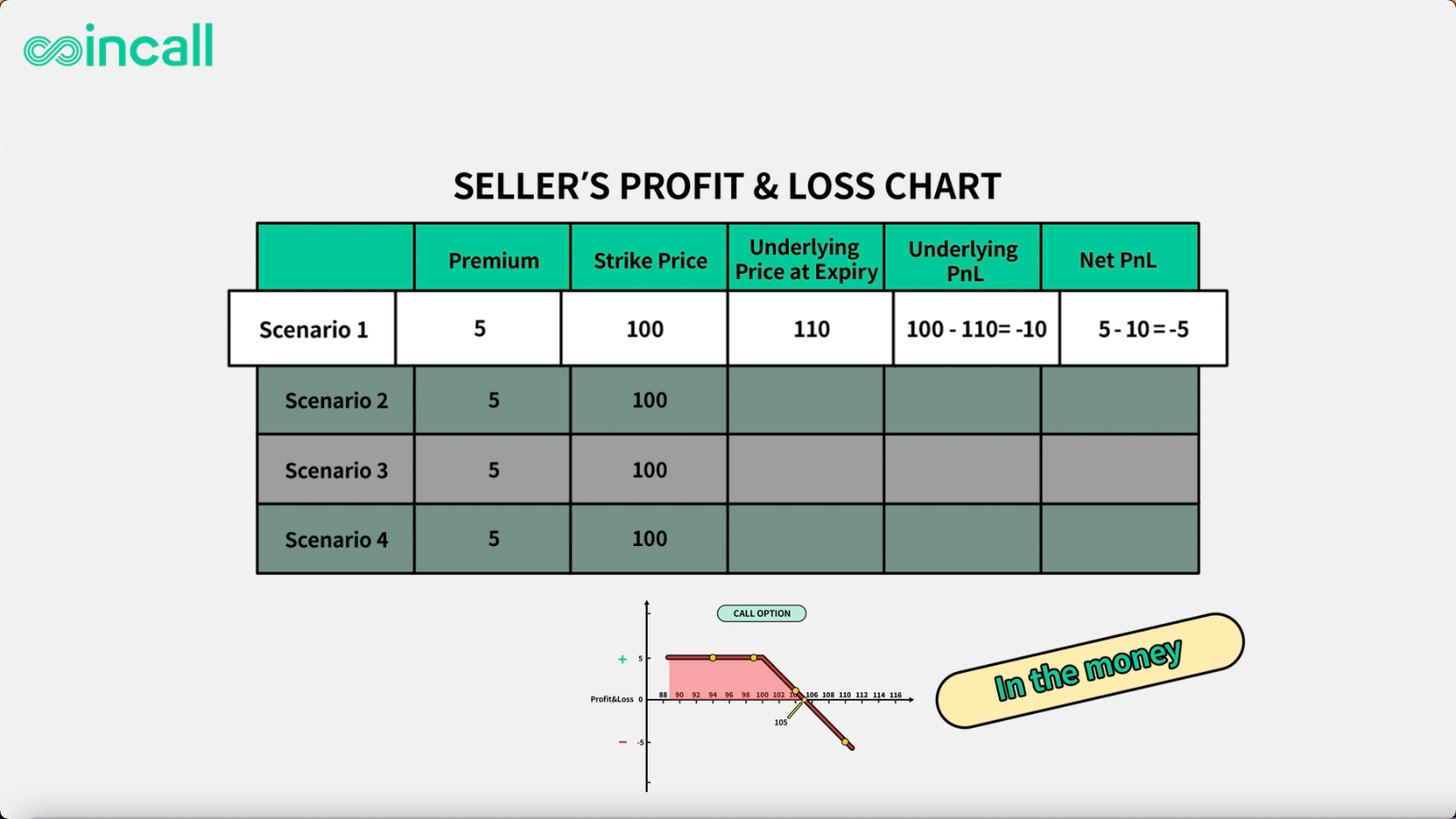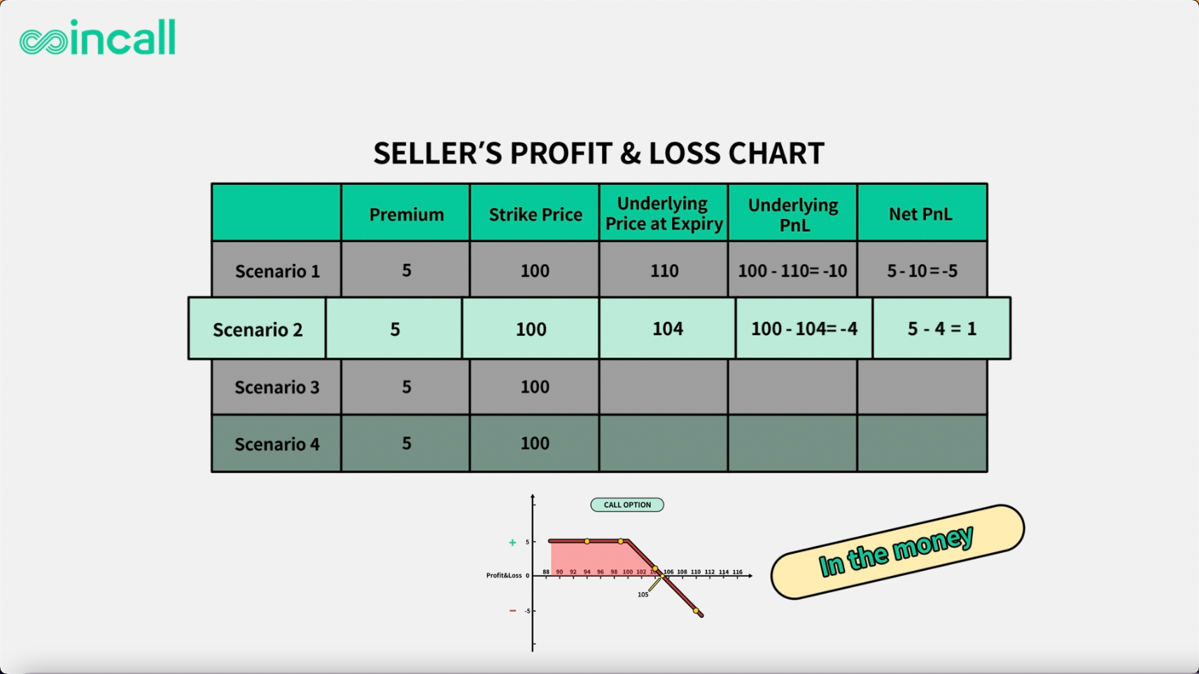 In scenario 3, the underlying price at option expiry is $99. This option is out of the money and will not be exercised. There will be no loss. Therefore, your $5 collected in premium will become your total profit.