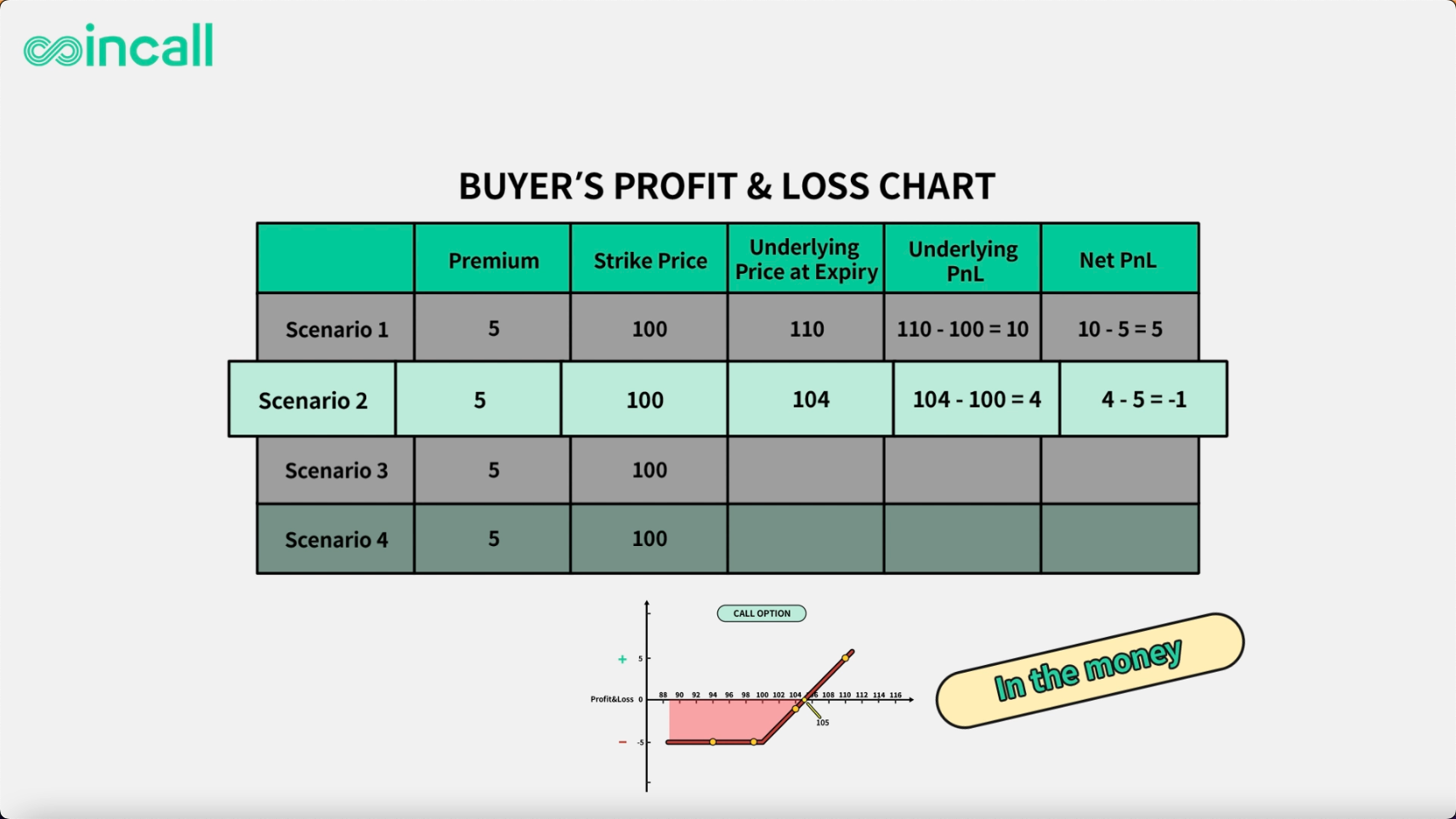 For scenario 2, the underlying price at option expiration will be $104. Again, this option is still in the money. You exercise this option at $100 and make $4. You paid $5 in premium, so your net will be a loss of $1.
