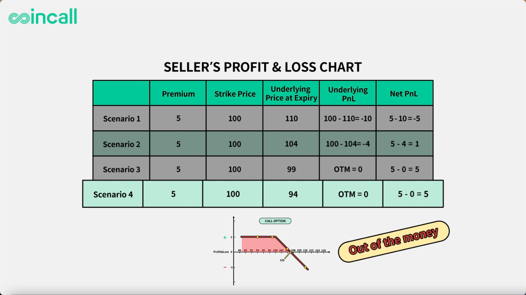 In scenario 3, the underlying price at option expiry is $99. This option is out of the money and will not be exercised. There will be no loss. Therefore, your $5 collected in premium will become your total profit.