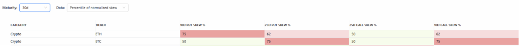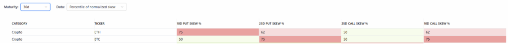 7-day Skew: Elevated demand for downside protection, with the 10D and 25D Put Skew at 75% and 100%, respectively.
