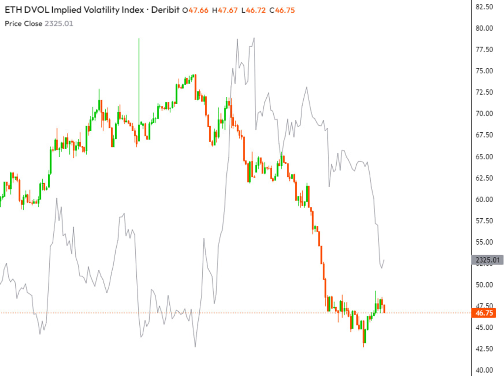 Market IV showed a slight decline compared to last week, reaching levels of 45 for BTC and 43 for ETH.
