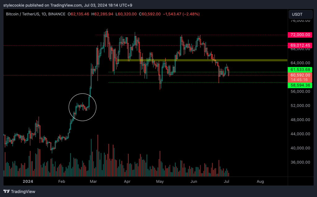 BTC may temporarily break $60,000, but I think it will be okay if it recovers on a weekly candle basis. The feeling of August 2023. 200DMA is $58,000 and if BTC fails to protect the support level, there is a possibility of a decline down to $50,000. The best situation for the Bulls is to recover $65,000-$66,000 in the yellow box. Once that level is recovered I would think BTC is headed towards a new ATH.