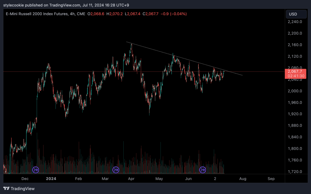 I think the stock market is making the right moves in this macro environment… ES breaks new highs every day. What I’m paying attention to these days is Russell’s movement. With yesterday’s advance, Russell is approaching the plumb line again and looks likely to break through the triangle convergence.