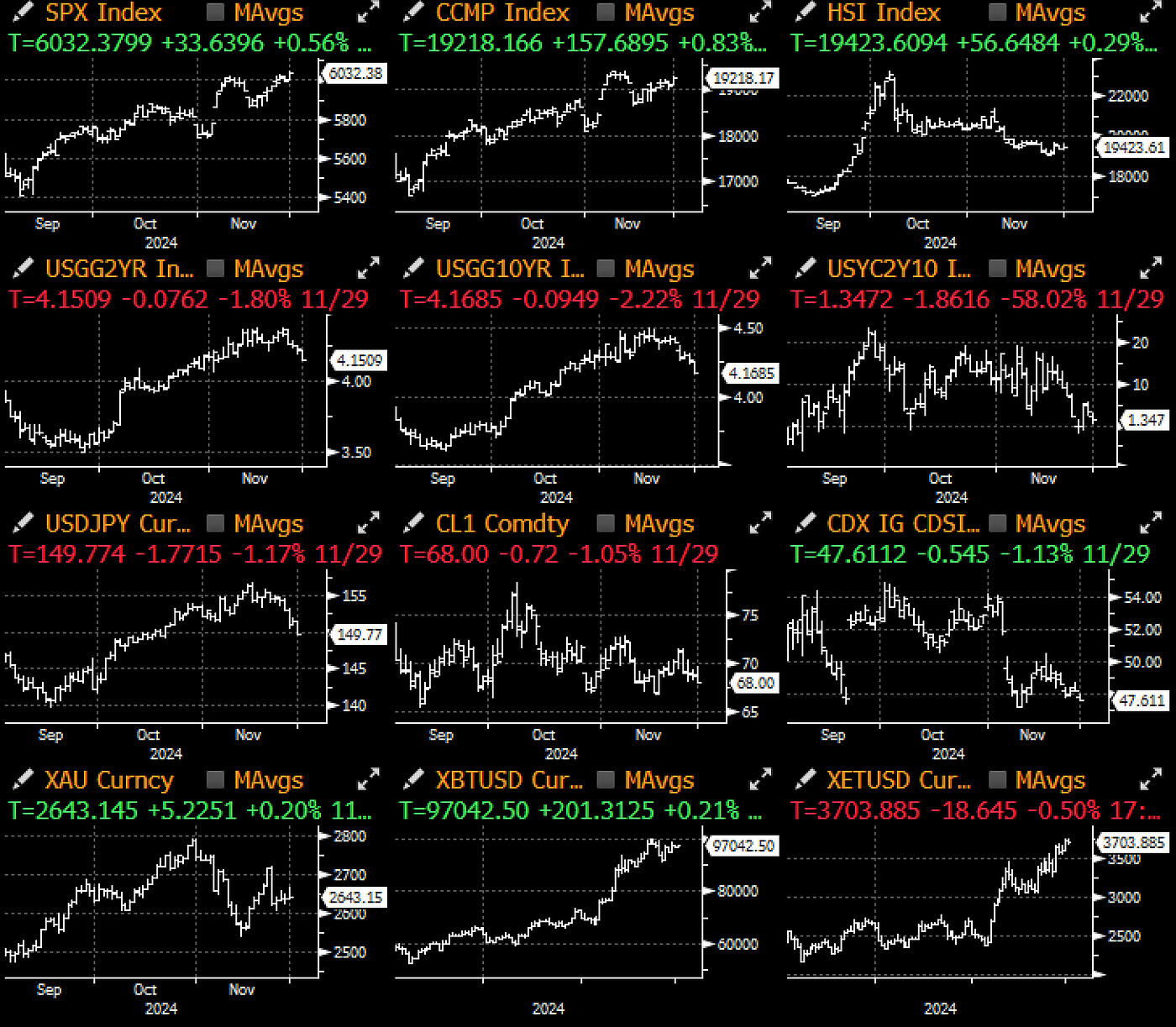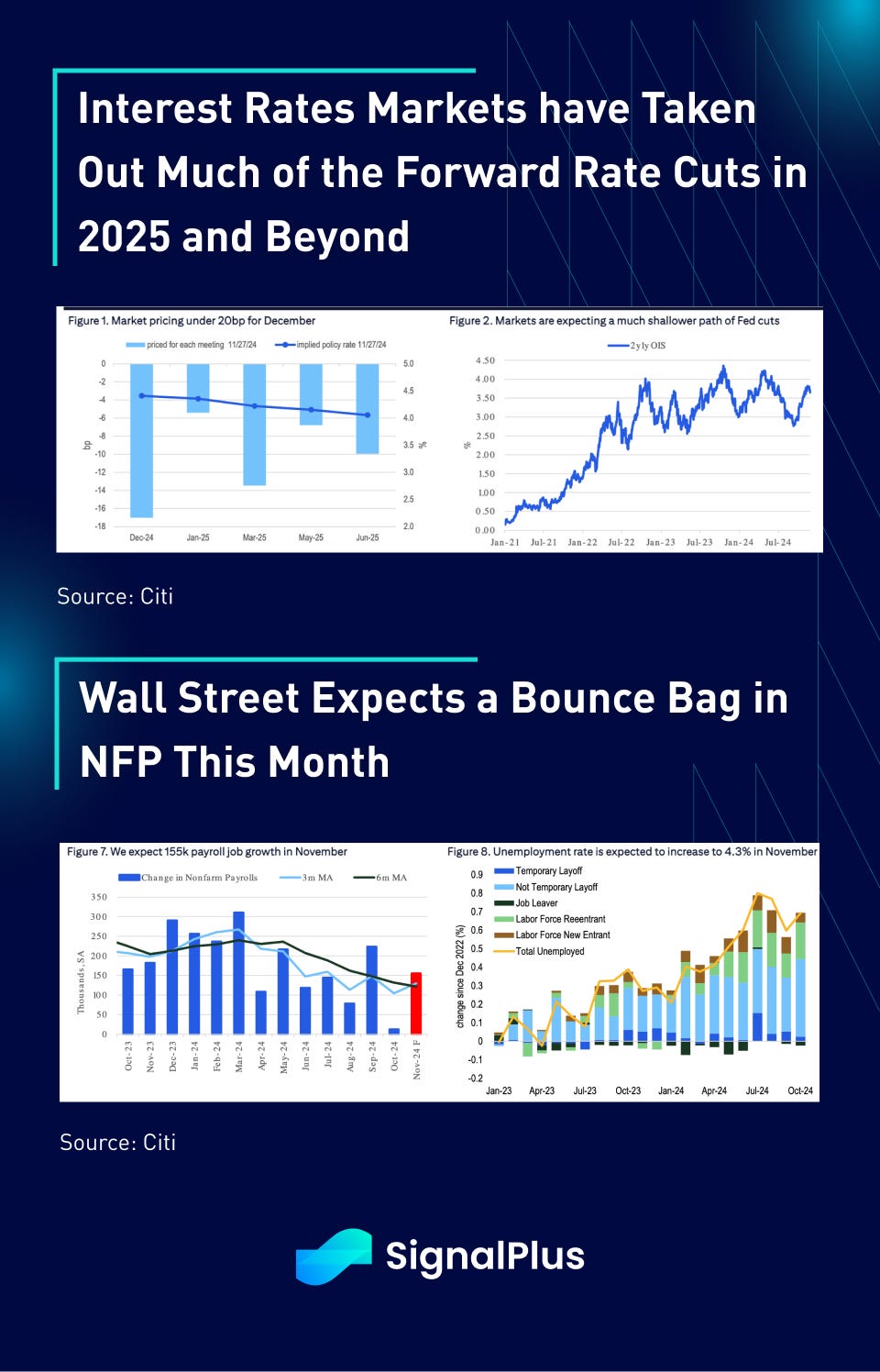 Traders will return to a busier week this week with the last NFP of the year. Fed cuts are still priced at around 65% despite nascent worries of an inflation pickup, though a substantial part of forward cuts (2025–2027) have been priced out given the underlying economic strength. In terms of payrolls, the street is expecting a bounce back in headline job figures to around the +160K area, with unemployment rate steady at around the ~4.3% level. Risk is likely to the weak side given recent weaknesses in PMI surveys and high frequency job data, but risk sentiment is likely to stay buoyant outside a truly surprising miss either way.