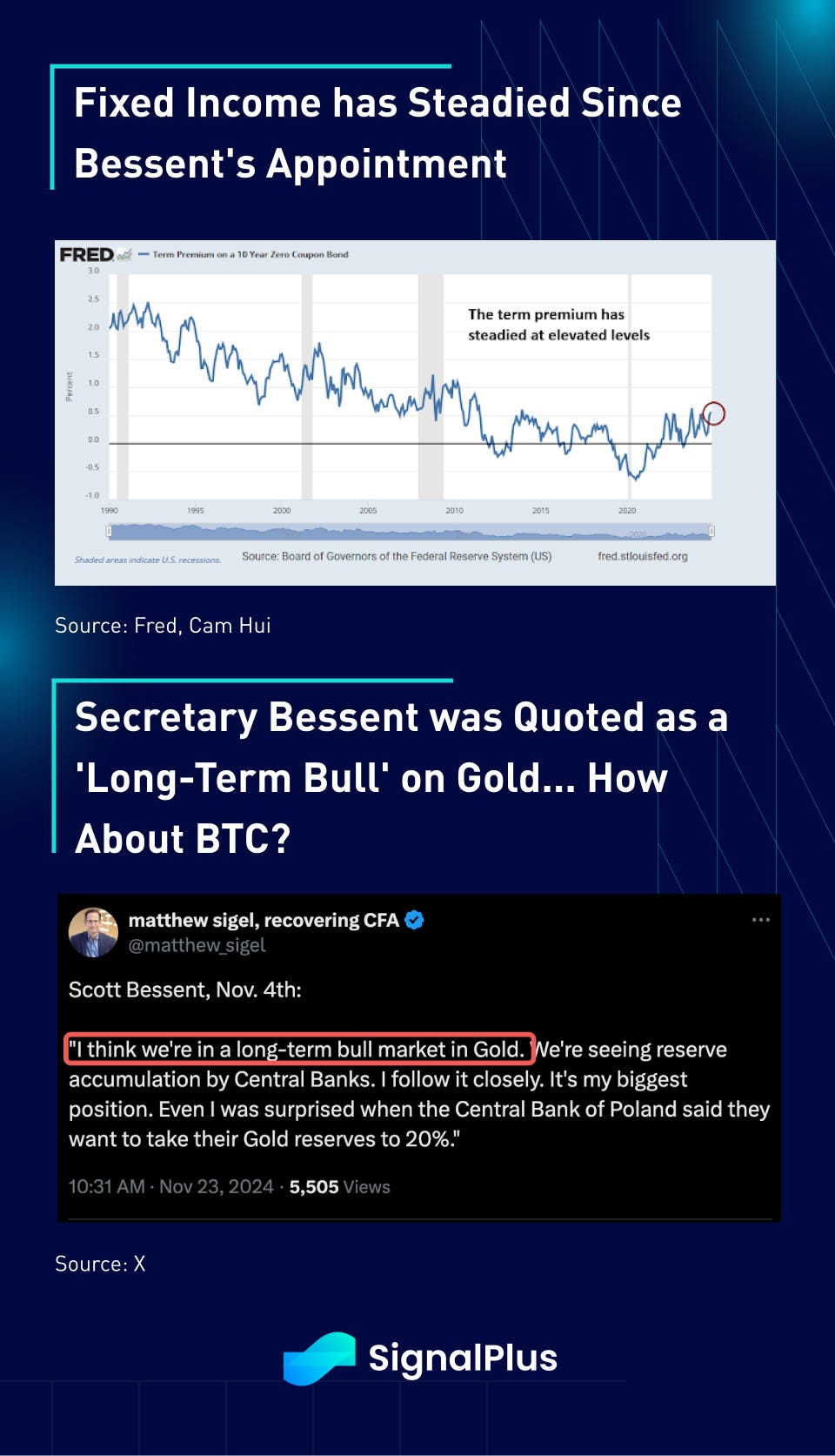 Along with his alleged ‘pro-crypto’ stance, Bessent is also known to be a fiscal hawk and supporter of an independent Fed, and his announcement of his 3–3–3 plan (fiscal deficit down to 3% of GDP, boosting real GDP growth to 3%, and raising US energy production by 3 million barrels per day) have brought a calming sense of relief to US fixed income. The yield curve premium has steadily at the current levels since his nomination.