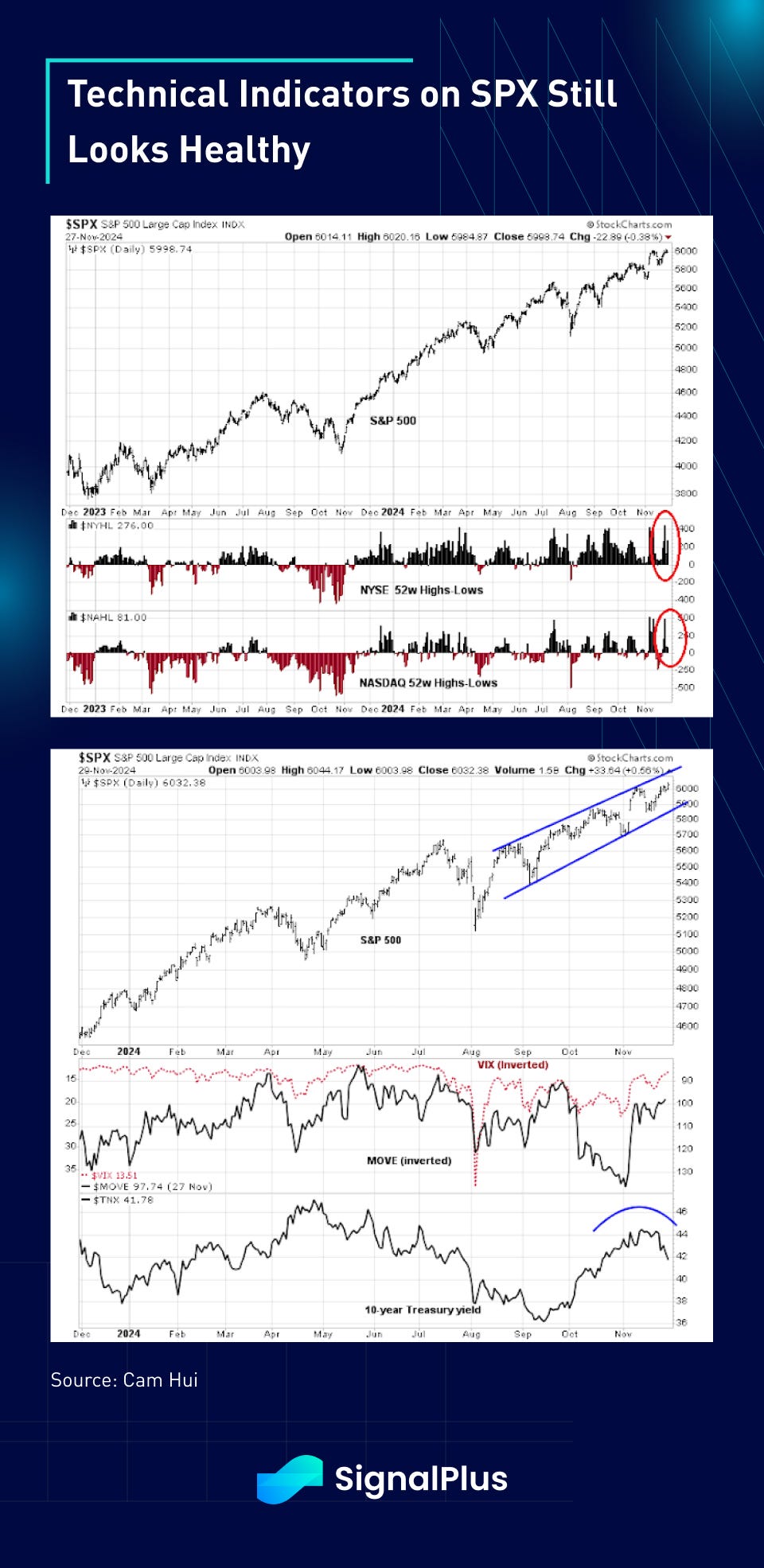 Market breadth remains supportive with net 52-week high-lows looking healthy, market uptrend remains in tact with VIX volatility on the down-swing, while treasury yields have calmed down with 10yr yields nearly 35bp lower from their October highs following the announcement of Scott Bessent as Trump’s new Treasury secretary.