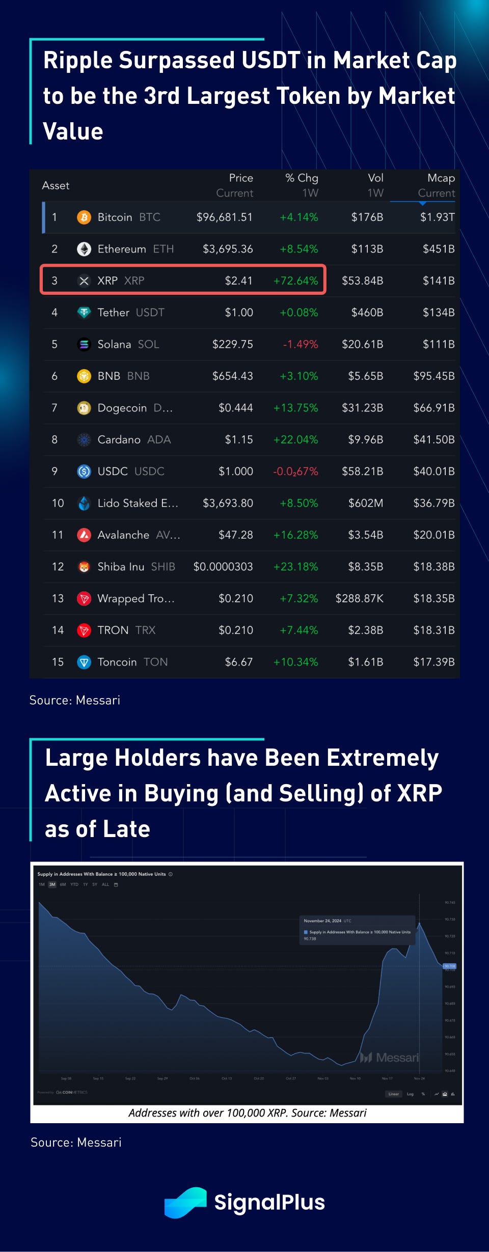 Crypto bullishness remains pervasive across the board, though the star this week is with Ripple as XRP has rallied by a staggering 73% following expectations that the govt will be dropping their long-running lawsuits. The significant rally has helped XRP surpass USDT as the 3rd largest crypto token by market cap, with whale addresses active in aggressive buying (and now selling) XRP over the past month in anticipation of this development.