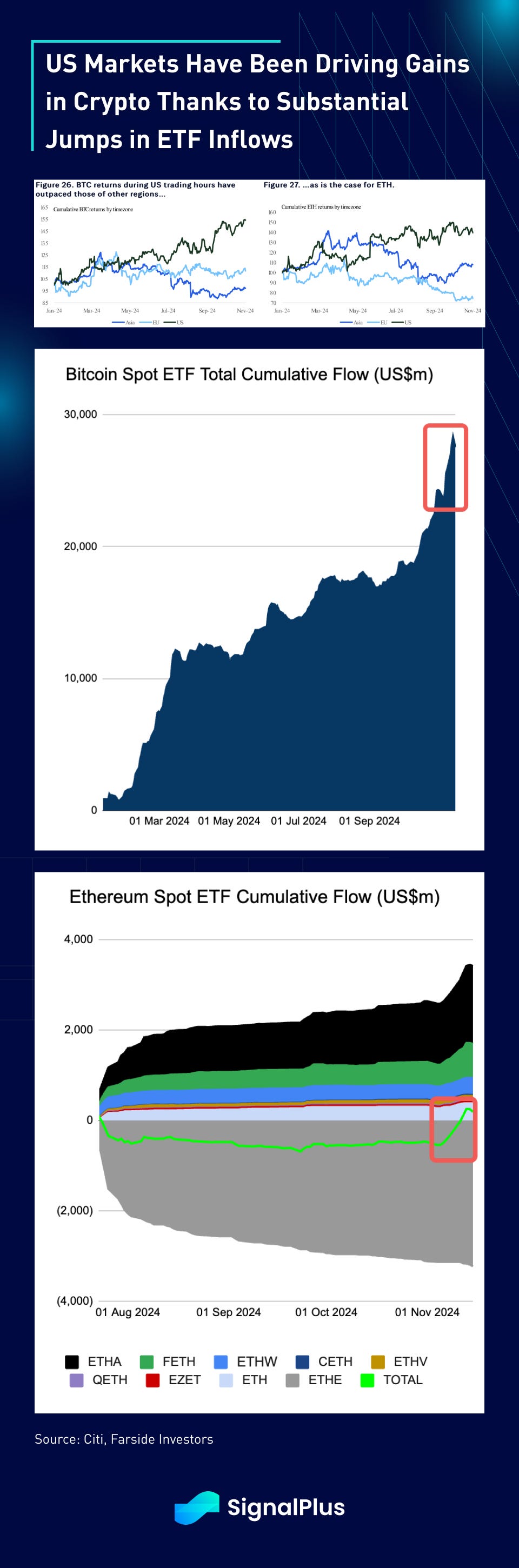 Crypto has by far been the hottest asset class following Trump’s election, with BTC rocketing to record highs above $90k and outpacing even its levered Nasdaq brethren. Gains have been led primarily in the US hours as mainstream participation has been increasing from the US, with spot ETF seeing dramatic inflows with BTC gaining +1.7B, and ETH adding +500M on a weekly basis.