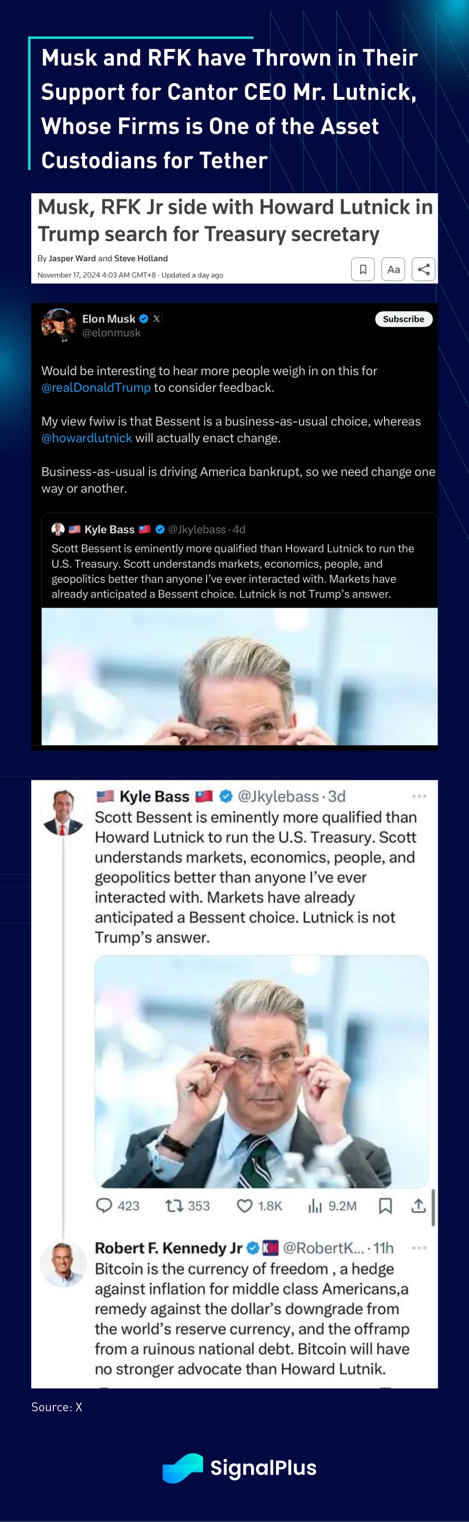 While the Mr. Bessent is seen as a ‘safe’ pair of hands with tremendous capital markets experience, the latter’s close relationship with Tether as one of their asset custodians is seens as a particularly interesting selection for the crypto community. Nevertheless, both candidates are generally seen as ‘pro-crypto’ as the industry continues to see headwinds with senior political supporters and a longer-term push of Bitcoin as a reserve asset class.