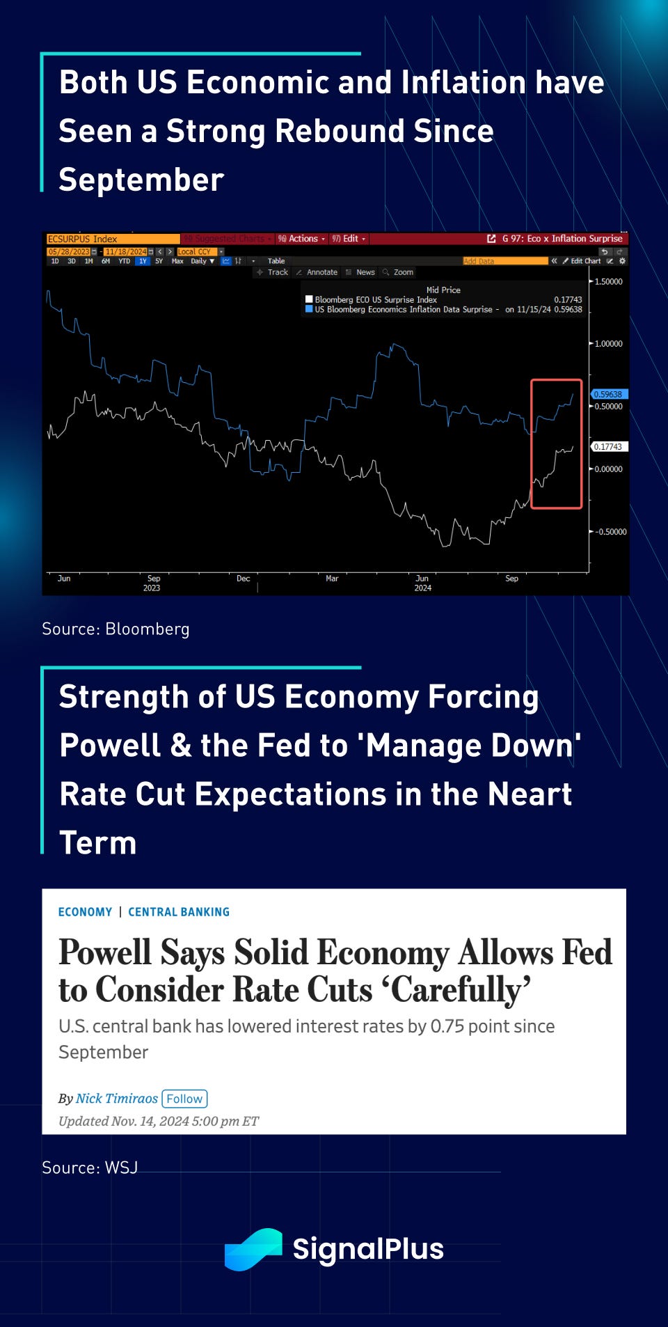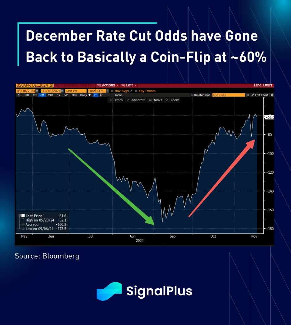 US equity markets gave back some of its recent gains (SPX -1.3%, Nasdaq -2.3% on Friday) on the back of extreme long positioning and worries over the continued climb in yield (10y nominals ~4.45%, real yields >2.15%). Furthermore, a late-week appearance by Chairman Powell suggested that the Fed is looking to slow down the pace rate cuts given the underlying strength in the economy, causing December rate-cut odds to drop to just 61%, versus a peak of nearly 2-cuts priced in during September.