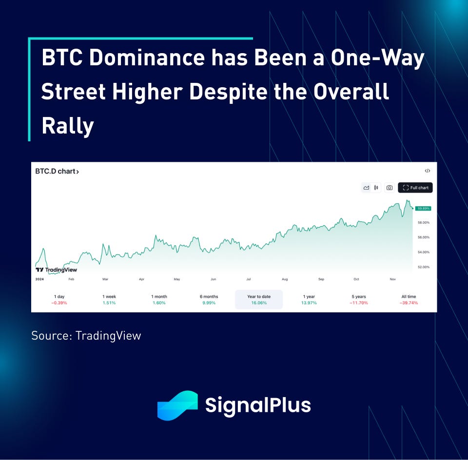 Overall, as similar to the policy views above, we feel that the ‘easy’ part of the rally has been done and the next stage will be much trickier with more price choppiness and potential for drawdowns. Despite the resurgence of memecoin mania ($PNUT!) and some signs of life in ETH, Bitcoin dominance remains on a one-way trend higher reminisence of the mega-cap dominance in SPX, and is not particularly desirable for this stage of the crypto ecosystem. Nevertheless, we’ll be on the look-out for a potential blow-off top in the near term with market sentiment at highly frothy levels. Be sure to manage your leverage well and be wary of more choppiness ahead!