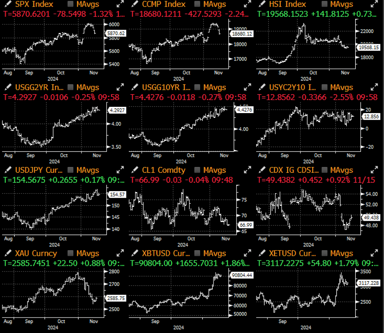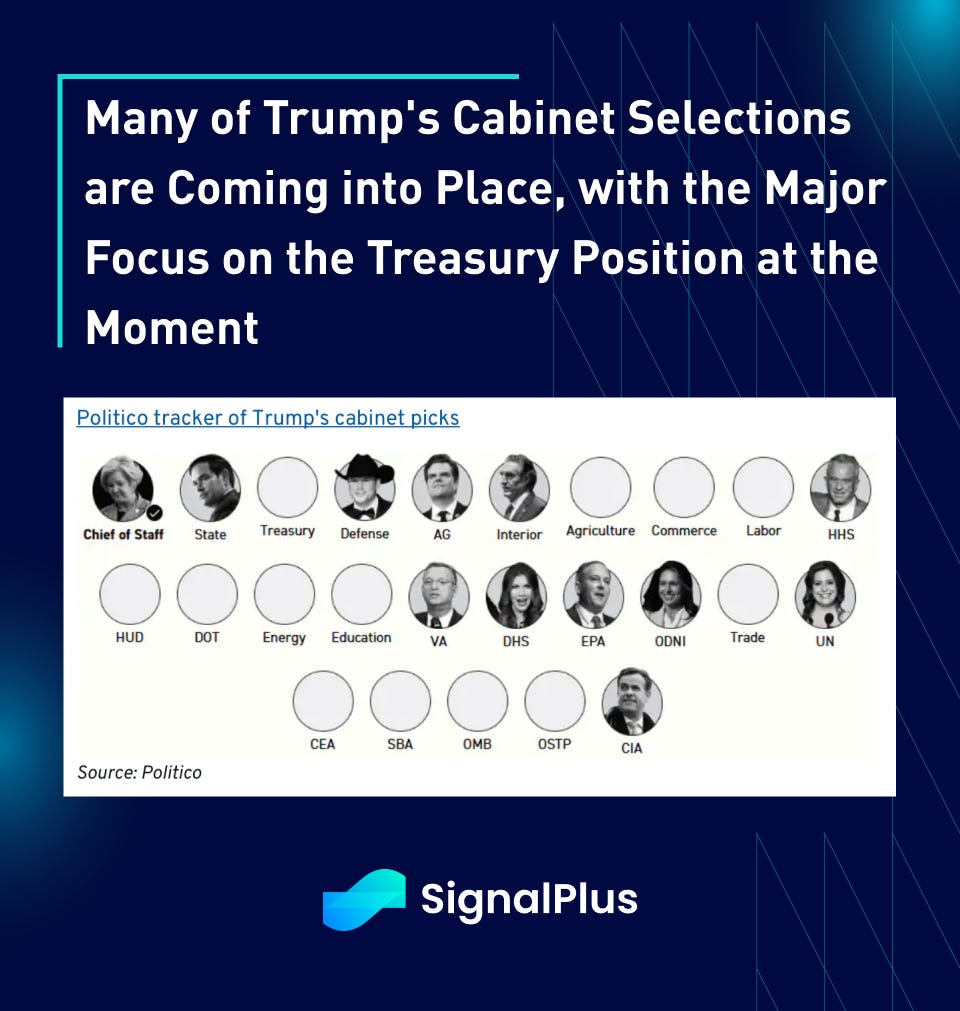 With President Biden explicitly looking to seek a ‘smooth transitiion’ with Trump, policies have now replaced elections as the major risk and focus on the market, with the market eyeing the President-elect’s cabinent selection like a professional sports draft. A number of key positions have already been filled, with a particularly ‘hawkish’ tilt, in particular on trade, big pharma, and national intelligence. One of the key remaining picks to be filled is the Treasury position, where we are seeing split support from the incoming Republican base on Mr. Scott Bessent (long time investor & Soros partner) and Mr. Lutnick (CEO of brokerage firm Cantor Fitzgerald).