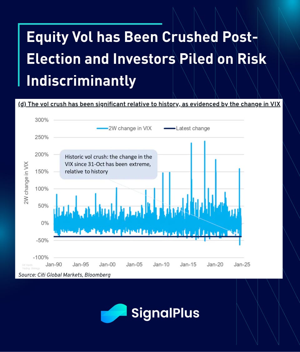 Prior to Friday’s large equity sell-off, the post-Trump window saw equity VIX fall from 23 down to 14, a nearly 40% drop over 2 weeks, a 99% percentile vol crush as reported by Citi. While the speed & pace of market moves continue to move faster and faster as seen in the historic equity and crypto (memecoin) rallies, though we feel that the easy part of the trade is over and markets are going to be in much choppier waters going forward from here.