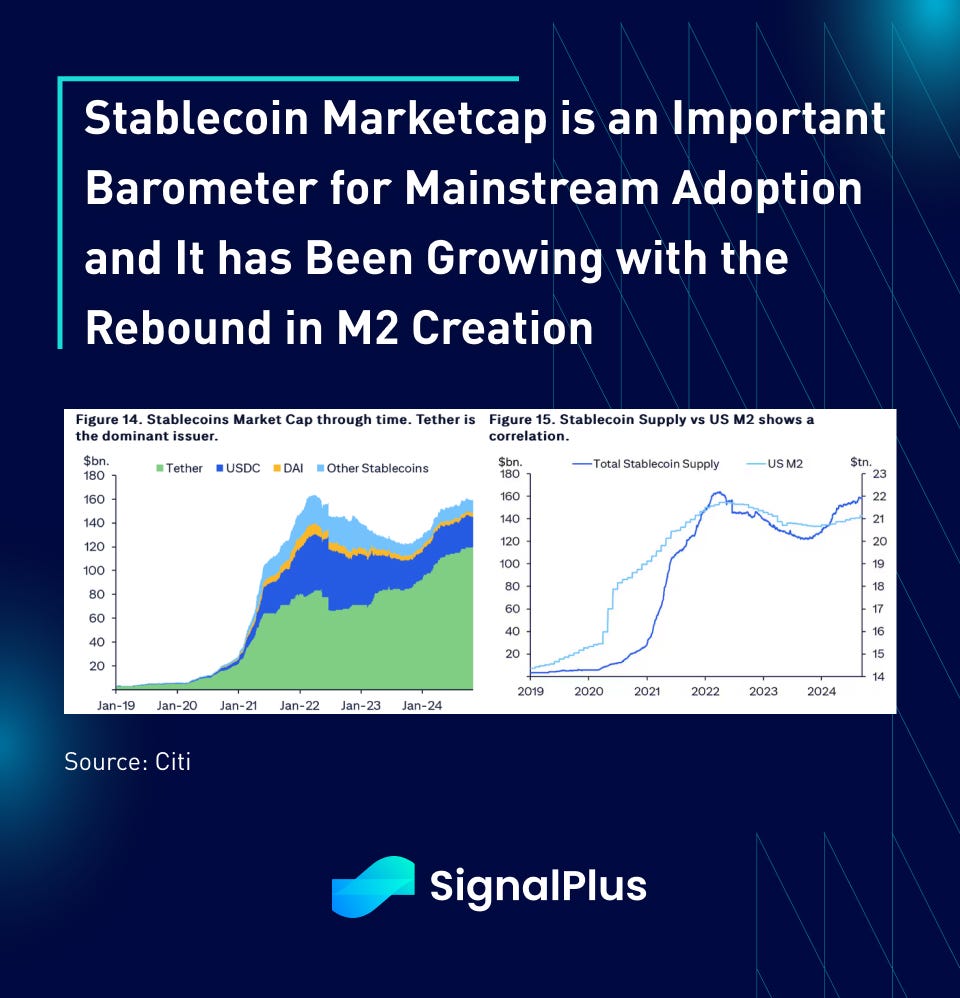 Another positive sign of mainstream participation is seen in the continued rise in stablecoin marketcap, where the total market cap has breached $160B and approaching the ATHs in 2022. Stablecoin is an important gateway for mainstream adoption as almost all on-ramp activities are probably done via fiat-to-stables as the first step. Furthermore, stablecoin supply has been largely growing in line with the pace of M2, which bodes well in the long-run if the US government were to return to net expansionary money supply policies.