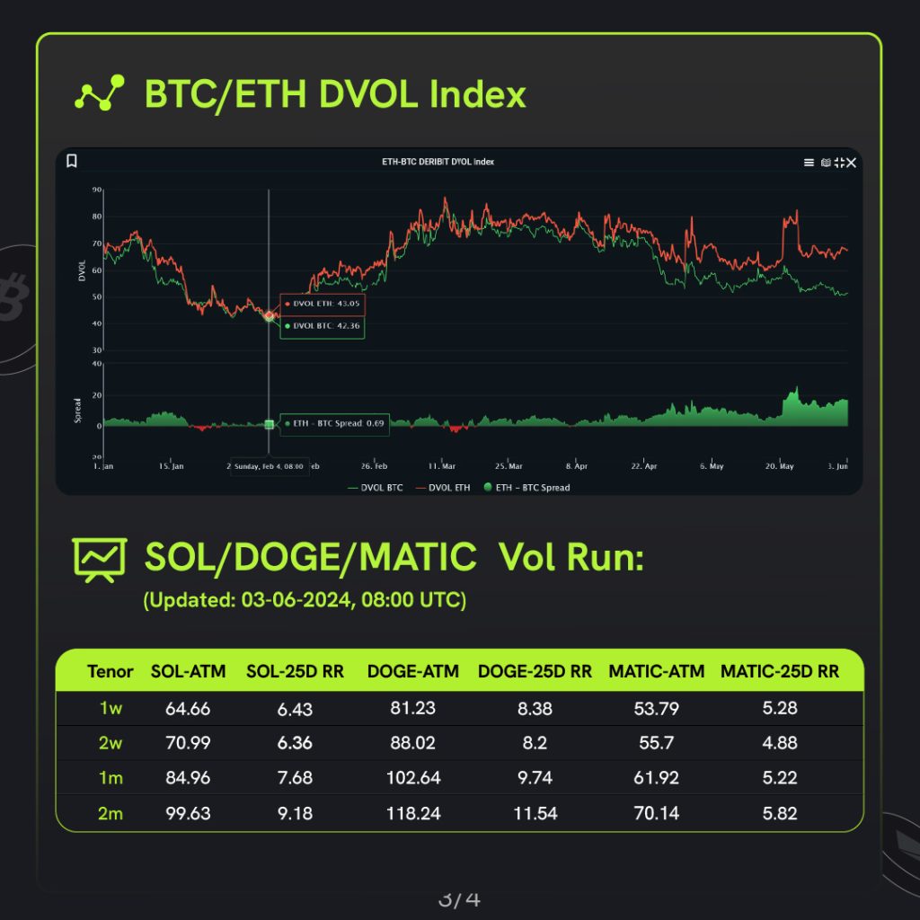 - BTC’s DVOL has continued to drop to 51, while ETH’s DVOL is around 67. This year, BTC’s lowest DVOL was in February, when it was near 42. This was followed by a big pump, with BTC’s price surging from $40,000 to a new ATH of $73,777. If BTC’s DVOL further drops below 50, the supply-demand dynamics in the options market will gradually shift from sellers to buyers.