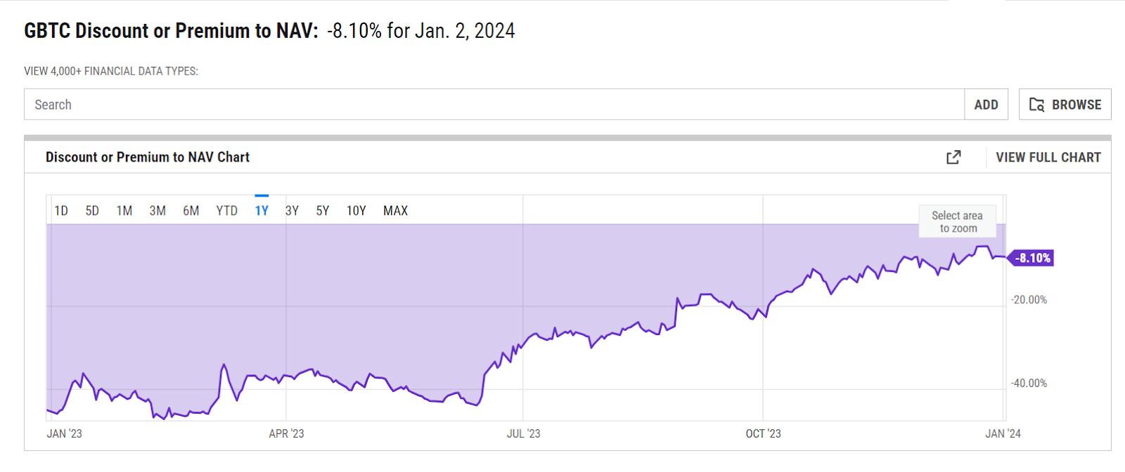 Bitcoin (BTC) experienced a rollercoaster, nearing $44,000 but then facing a downturn following a dip in U.S. stocks. Despite this, Grayscale’s Bitcoin Trust Fund (GBTC) has seen its discount to net asset value (NAV) narrow, holding near its smallest since August 2021, fueled by optimism over a potential U.S. bitcoin spot ETF approval.
