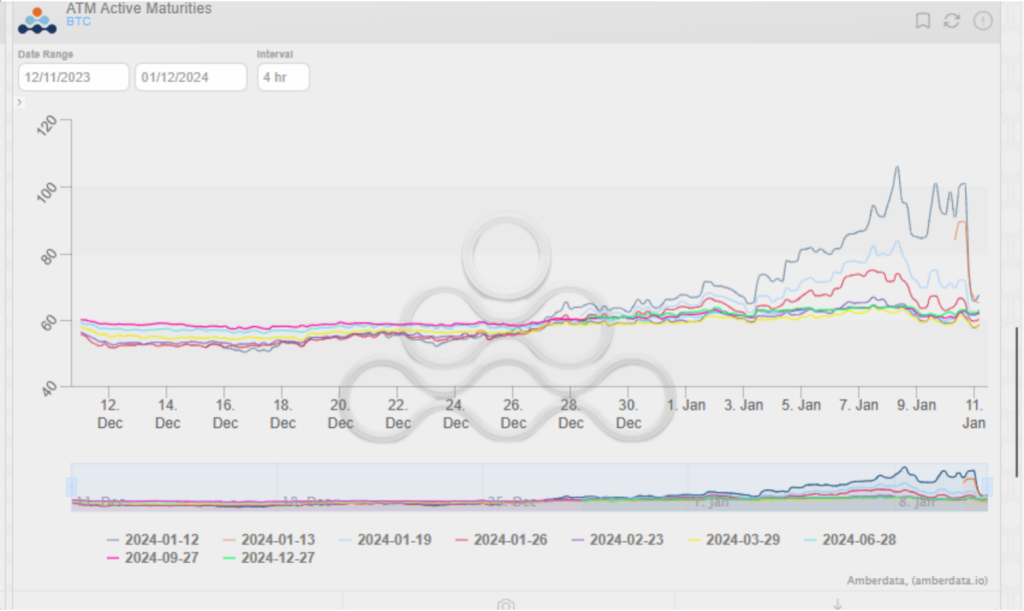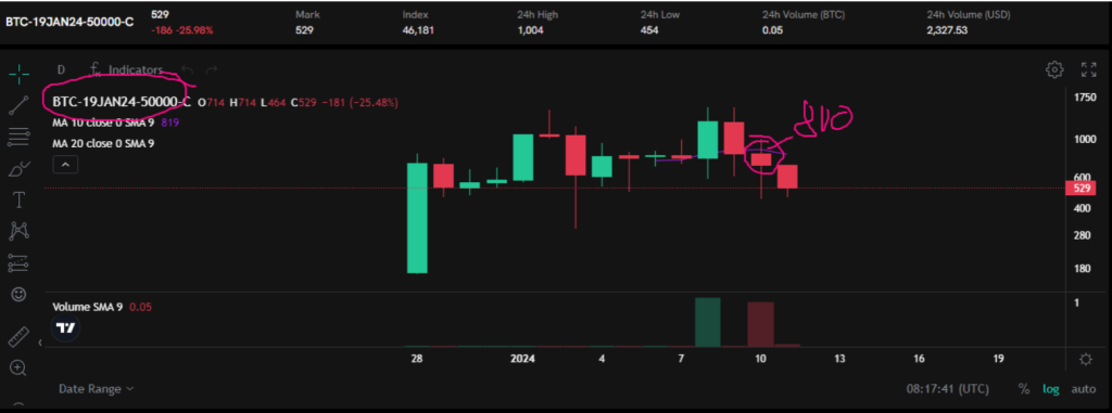 Sale la noticia y el BTC apenas se mueve; incluso, para hoy, 11 de enero, está un poco por encima del precio al que compraste. Sin embargo, tus opciones de compra ahora valen un 30% menos, aproximadamente 500 USD.