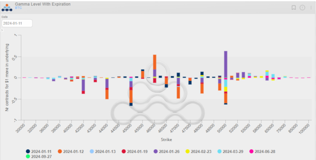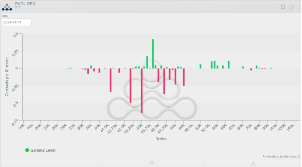 Se veo claramente que la zona importante es la de 45K de BTC, esta zona es como una muralla de coberturas no deberiamos perdarla, vemos que la zona de 47K a 50K esta llena de gamma negativa. Aka, si llegamos la zona resisitra, pero si la superamos puede correo hasta los 52K pero tenemos que ver todos los dias como cambian estos numeros.