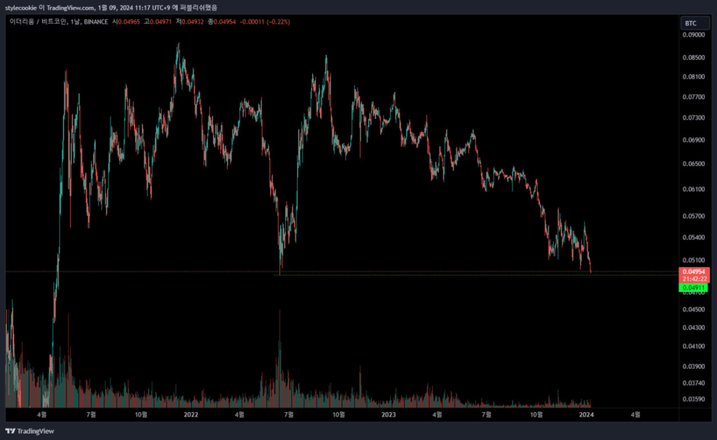ETH에 대한 이야기가 많아서 제 생각을 공유하자면 저는 단기적으로 ETH가 좋아보입니다. 이러한 의견은 매우 리스크가 있지만 어쨋든 그렇습니다. ETH/BTC는 거래량으로는 바닥이라고 판단할 수 없지만 지속적인 하락을 겪고 있으며 단기적으로 바닥에 가깝다고 보고있습니다. 실제 BTC 현물 ETF가 승인되면 추가적으로 더 하락할 수 있지만 SEC는 ETH를 증권으로 규정하지 않고 있기 때문에 BTC가 승인된다면 ETH도 승인될 것이라고 생각합니다. ETF에 대한 새로운 이야기는 ETH로 전환될수도 있습니다.