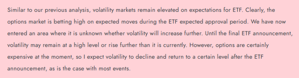 충분히 ETF 기대감으로 지난 2달동안 훌륭한 움직임을 보여주었습니다. 저는 시장이 상승을 이어나가더라도 향후 내재 변동성은 하락한 상태를 어느정도 유지할 것이라고 생각합니다.