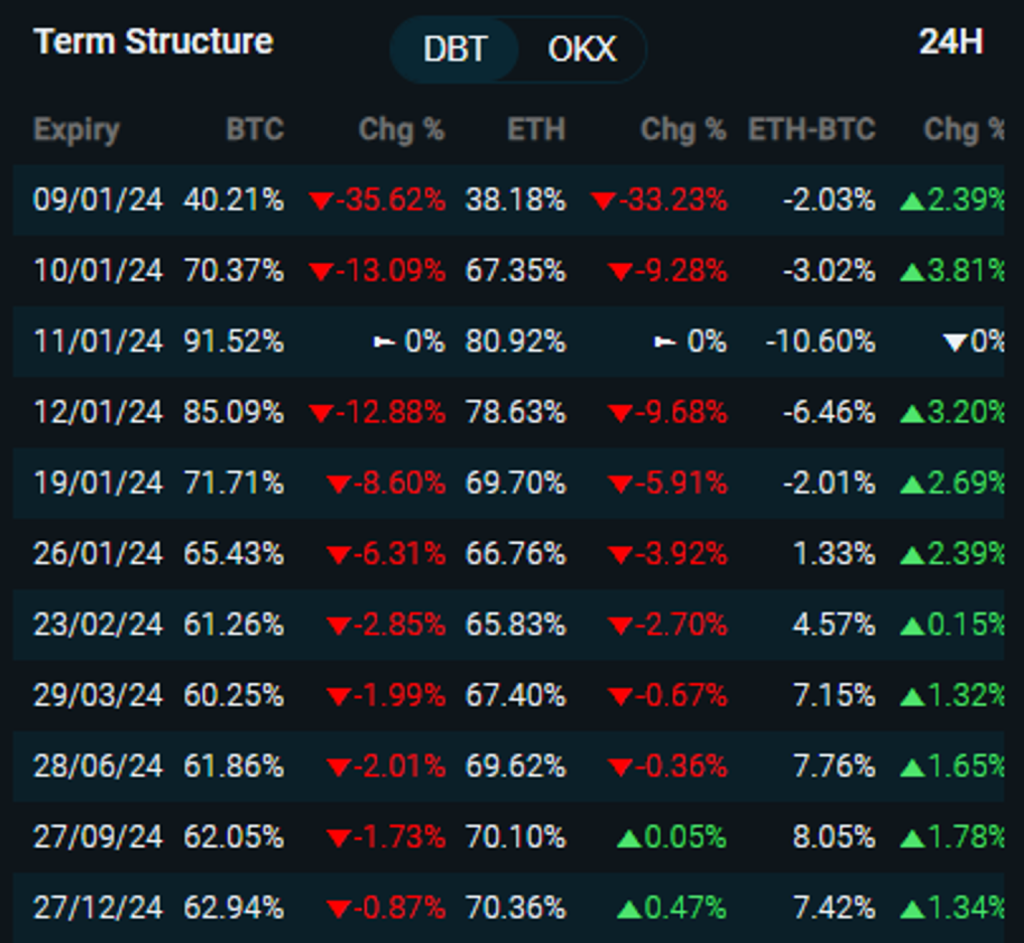 변동성에 대해서는 이전의 뷰를 베이스로 이어갑니다. ETF 승인이 확실시 되기 전까지는 변동성이 높은 상태를 유지할 것이지만 승인에 매우 가까워짐에 따라 변동성은 다른 이벤트와 같이 하락하여 일정 수준을 되돌릴 가능성이 높습니다. 이미 겐슬러 의장의 트윗 이후 사실상 ETF 승인 확률이 99.9%에 가까워졌고 BTC와 ETH vol은 8포인트씩 예상보다 빠르게 하락했습니다.