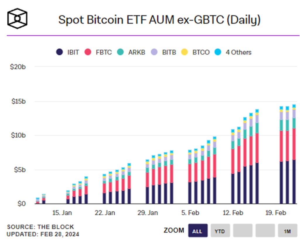 현재 BTC 현물 ETF는 금 ETF의 절반 수준까지 빠르게 성장하였습니다. 31일 거래일만에. 매우 놀랍고 빠른 속도입니다. GBTC AUM을 제외하고 보아도 $15B입니다.
