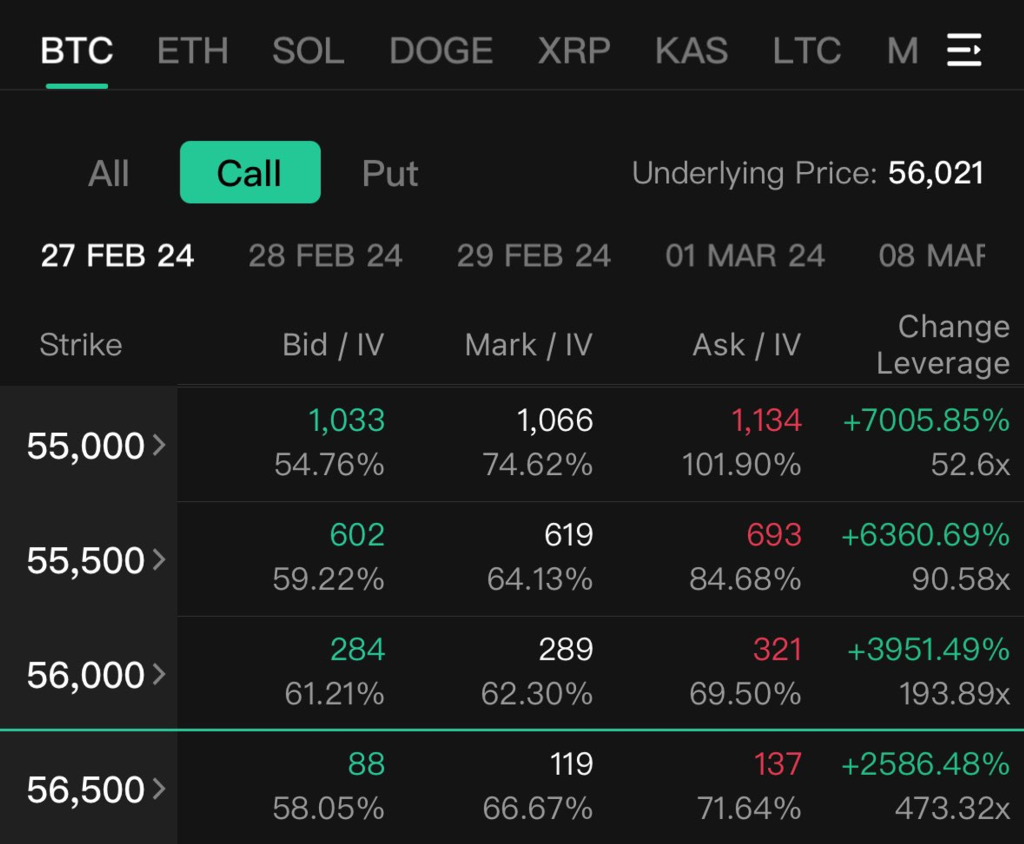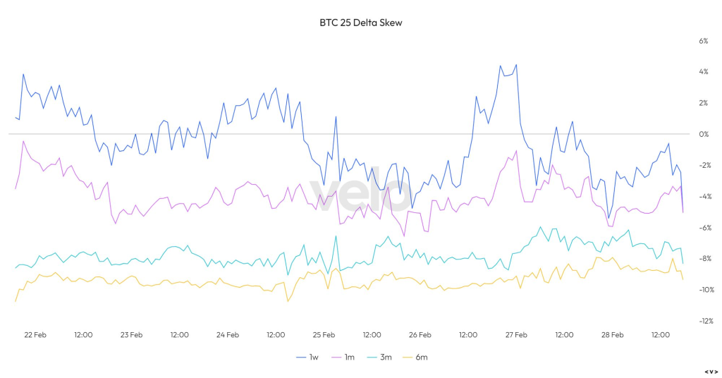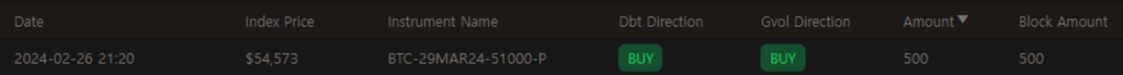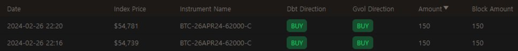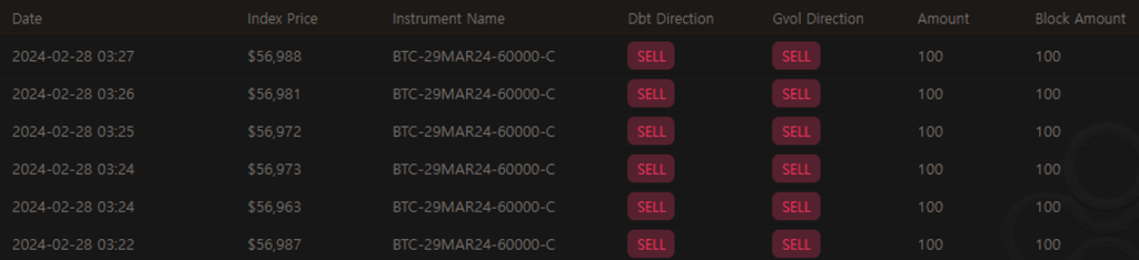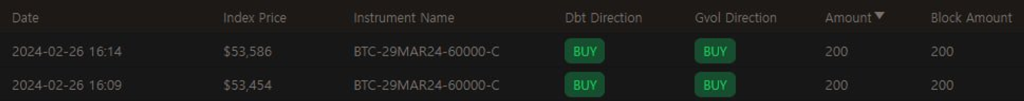 BTC의 2월 마지막 주 강렬한 상승에 힘입어 단기간에 vol도 10포인트 가량 상승했습니다. 현물-vol 상관관계가 긍정적이였기 때문에 콜옵션 매수자들은 좋은 이익을 얻었을 것으로 생각됩니다. 특히 0DTE와 같은 짧은 만기 옵션들에게 로또가 터졌습니다.