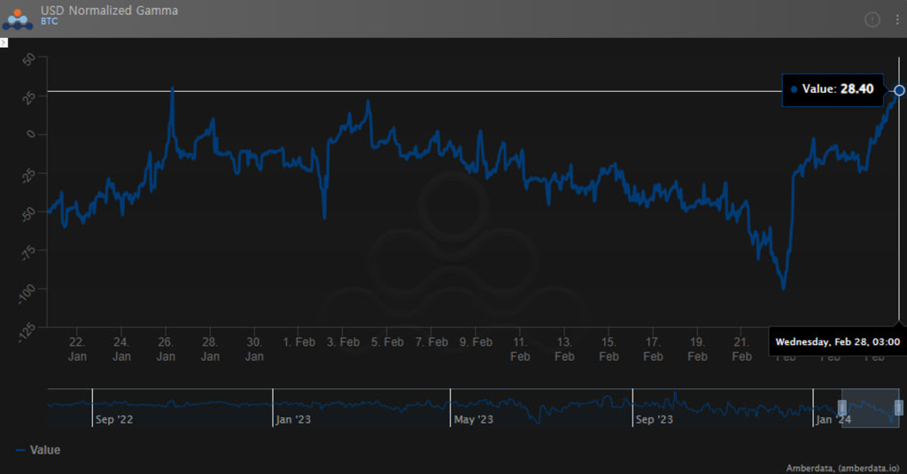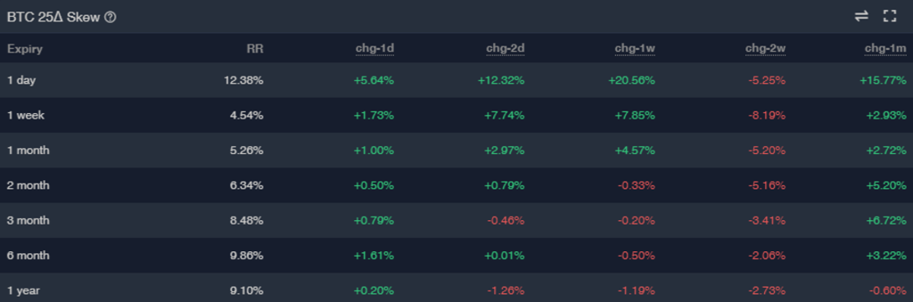 우리는 현재 롱감마 상태에 있지만 트레이더들은 높은 행사가에 BTC 콜옵션을 매도하고 있습니다. BTC 가격이 계속해서 빠르게 높아진다면 그들이 위험해질 가능성이 있습니다.