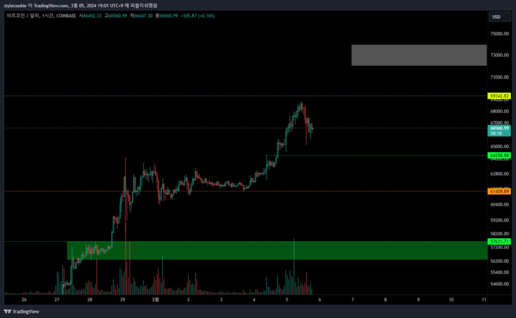 어떤일이라도 일어날 수 있는 상황이지만 저는 3번의 가능성으로 시장을 바라보고 있습니다. 여기서 한번 더 고점을 갱신하는 움직임이 나타날 것이라고 생각합니다. 어떤 레벨에서 상승이 멈출지는 알 수 없지만 $72,000 ~ $74,000 레벨이 될 것 같다고 판단하고 있습니다.