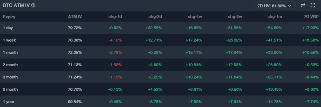 BTC의 예상보다 강하고 빠른 상승에 Vol도 함께 반응하면서 콜옵션 구매자들을 웃게 만들었습니다. Vol은 20포인트 상승했으며 BTC가 빠르게 ATH에 가까워지면서 사람들의 옵션 수요도 점차 증가하였습니다.