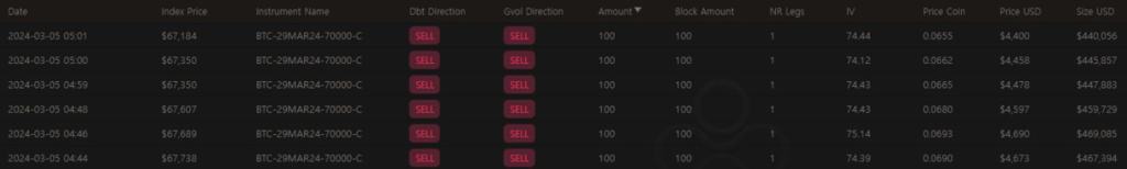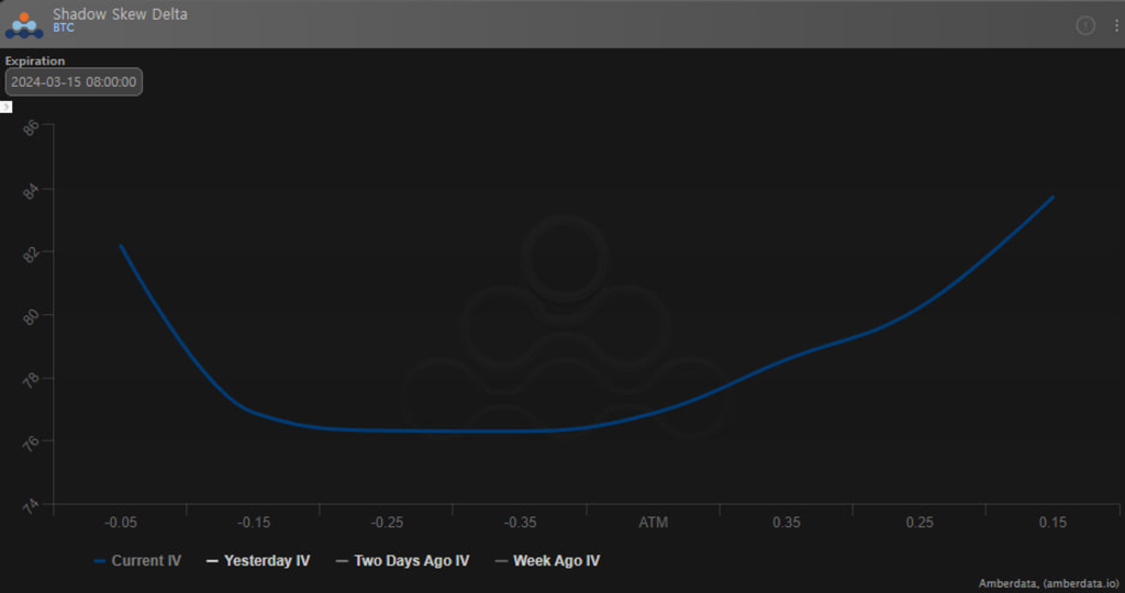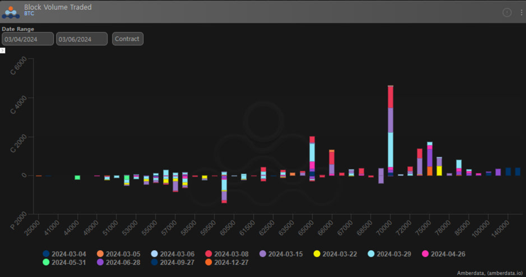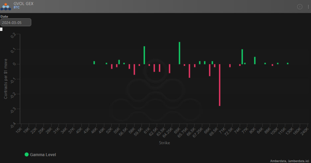 지난 분석에서 보았듯이 높은 행사가 콜옵션을 매도한 사람들은 Vol도 높아지고 현물 가격도 상승함에 따라 피해를 입었을 가능성이 있습니다. 현재 BTC 옵션시장에서 가장 인기있는 행사가는 $70,000이며 3월 주간, 월간 옵션 모두에서 가장 큰 감마 레벨입니다.