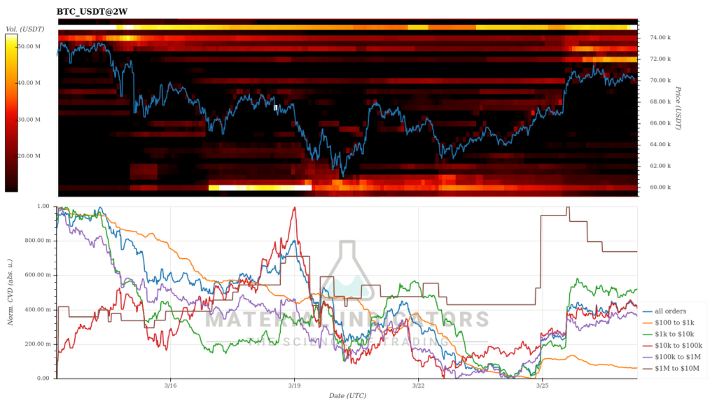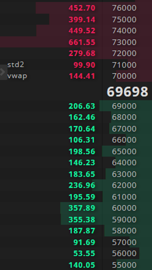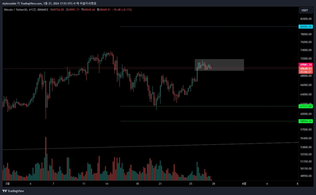 1.FOMC에서 파월 의장의 강한 비둘기 발언 이후 BTC는 상승과 하락을 반복하다 주말에 천천히 회복하여 $70,000 레벨을 되찾았습니다. 매우 중요한 레벨이고 차트에 표시된 것처럼 BTC는 이 레벨에서 몇일간 다시한번 축적을 보여줄 가능성이 있습니다. $80,000이 가깝다고 느껴집니다.