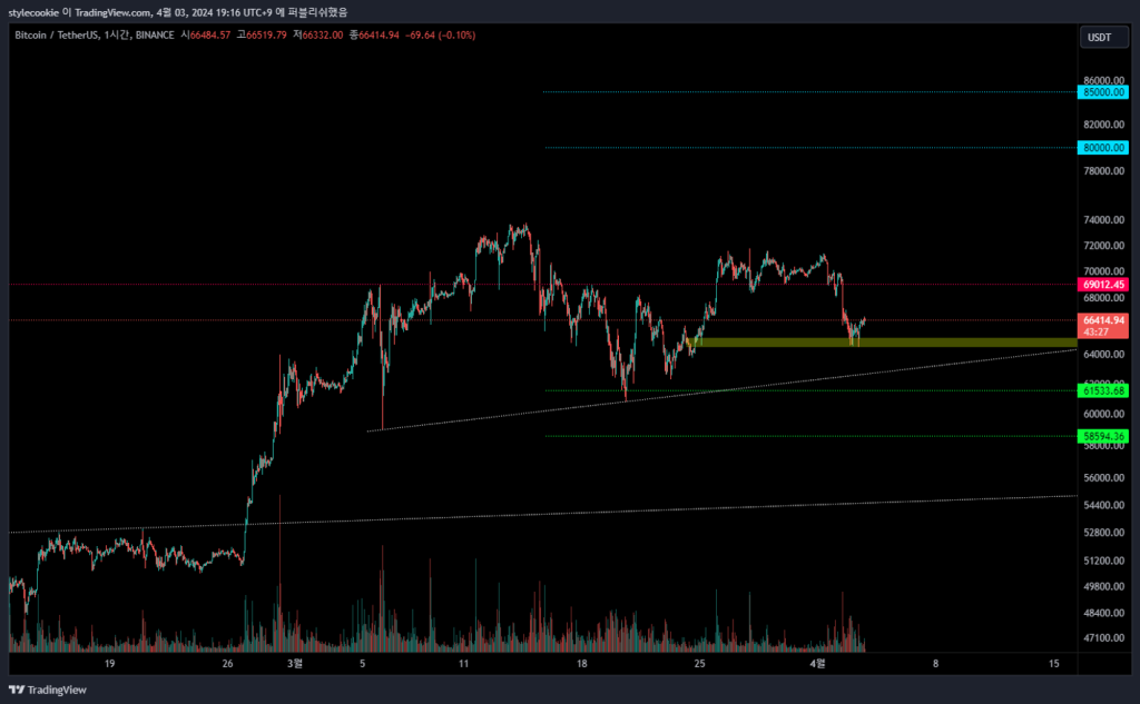 안녕하세요 4월의 시작입니다. BTC에게 4월의 시작은 분명히 나쁘게 출발했습니다. 우리는 $70,000 레벨을 방어하지 못했고 결국 10% 하락했습니다. 3주전과 지금은 달라진게 많지 않습니다. 여전히 BTC는 횡보하고 있고 상승 추세는 살아있습니다. 커뮤니티에는 피드백을 했지만, 저는 우선적으로 삼각수렴을 생각하고 있습니다. 또한 지금의 하락이 $80,000+로 향하기 전 마지막 조정이라고 봅니다. 한번의 하락이 더 있다면, $62,000~$63,000을 지켜주는 것이 베스트입니다. 이 레벨이 깨지면 BTC가 더 많은 하락을 보일 가능성이 높으며 게임이 어려워 질 것으로 예상합니다.
