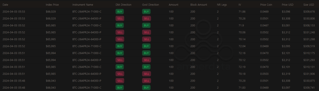저번주에는 분명히 Risk Reversal 전략을 하락 반전에 사용했던 트레이더가 있었지만 오늘은 상승 반전에 사용한 사람이 있습니다. $64,000 풋옵션을 매도하고 동시에 $71,000 콜옵션을 매수합니다.