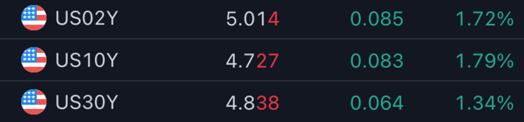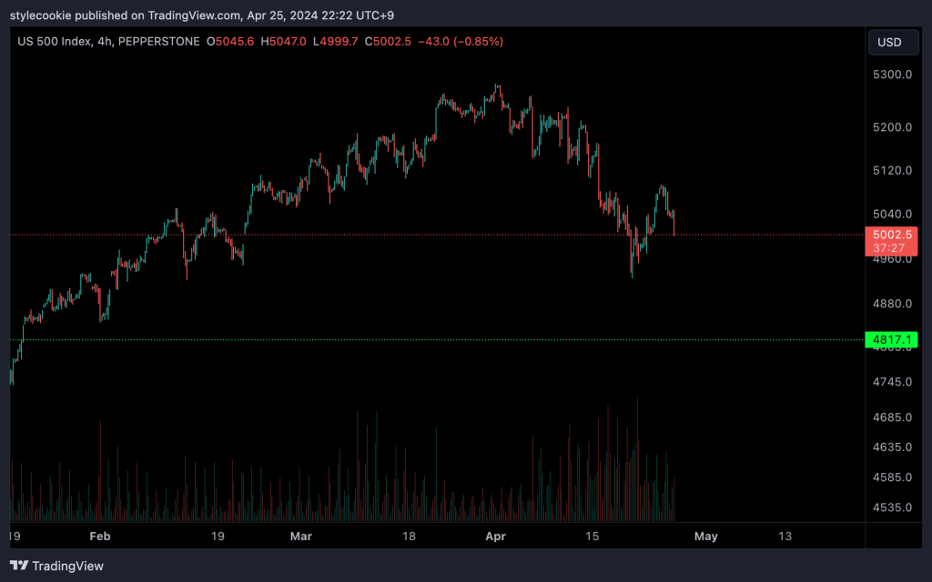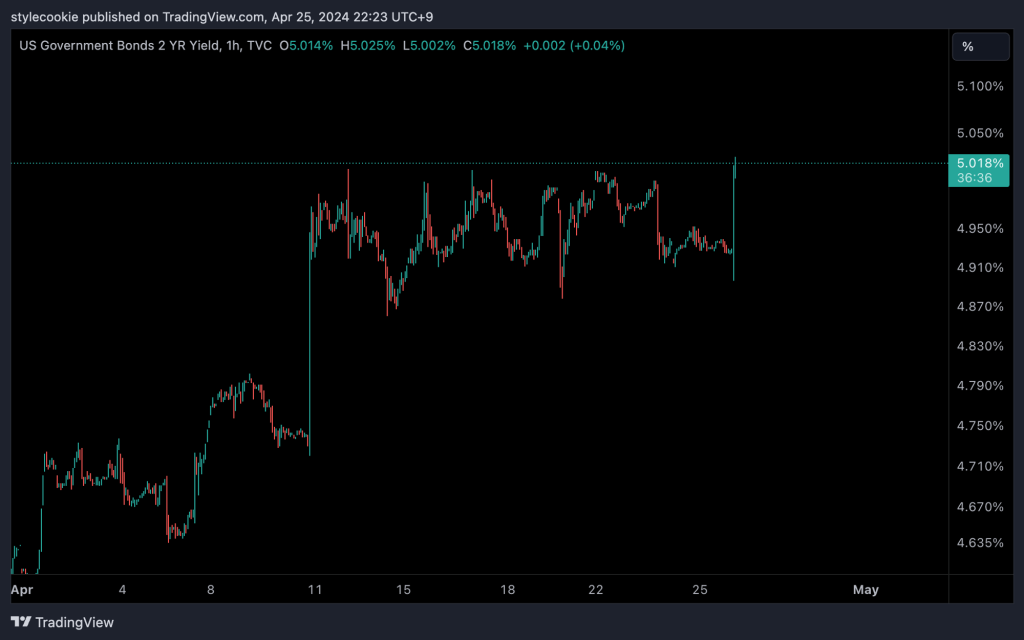 GDP와 실업수당 데이터가 발표되고 Yield는 시장에게 폭탄을 선물하고 있습니다. 10Y는 4.8(패닉 레벨) 직전인 4.7%까지 상승했으며 2Y는 올해의 금리인하 기대를 낮추고 있습니다(올해 한번 또는 한번도 금리인하가 없음). 데이터에 대해 정직한 반응이지만 10Y가 지속적으로 상승하는 것은 시장에 분명히 좋지않은 신호입니다. 계속 체크하는 것이 도움될 것입니다.
