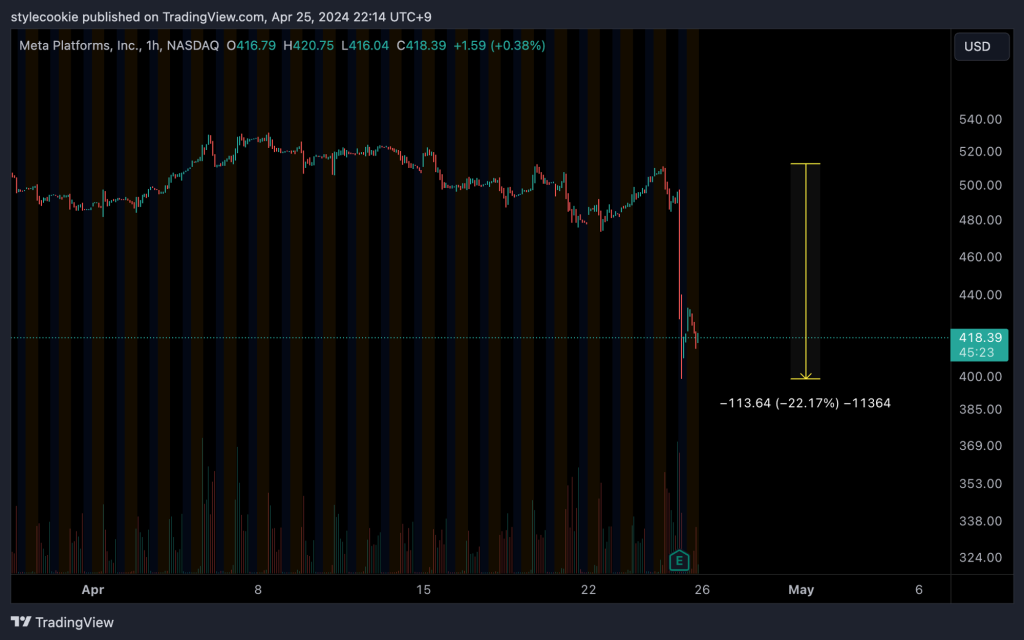 어닝에서 가장 주목 받았던 것이라면 TSLA와 META일 것입니다. 여기서는 META에 대해서만 이야기 하겠습니다. META의 어닝은 분명히 좋은 결과였지만, 가이던스가 나빴습니다. 기대이하 가이던스에 주가는 20% 하락했습니다. 여기에는 META의 수익은 대부분 광고 사업이고 자본지출이 늘어나게되면 수익성이 악화될 것이라는 우려가 포함되어 있습니다. 우리가 느낄 수 있는 것은 AI에 대한 기대가 많이 줄어들고 있다는 것입니다. 물론 이러한 기대는 단기적이라고 생각하지만, 현재 AI 관련된 섹터 모두가 영향을 받고있습니다.