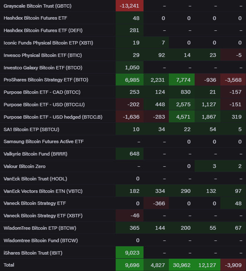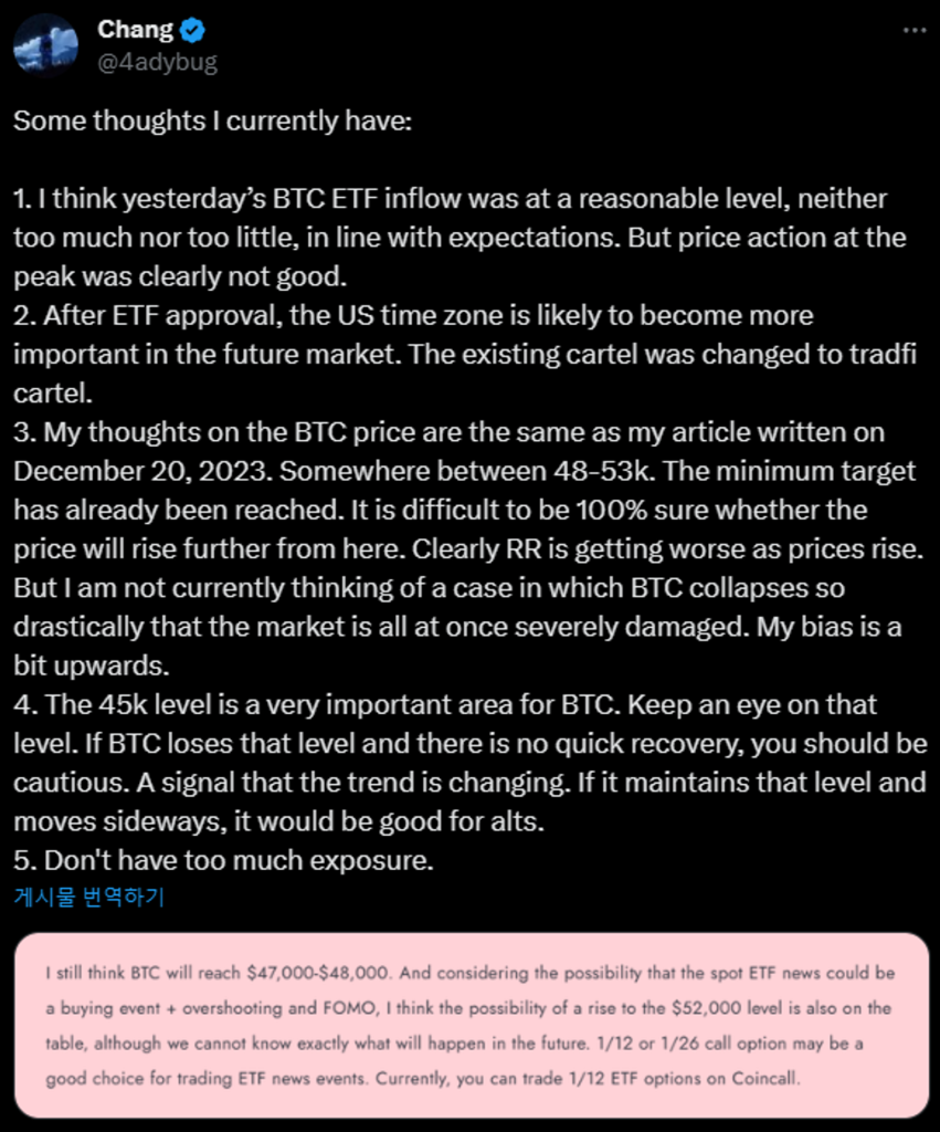 현재 시장은 GBTC 유출과 나머지 ETF 유입이 서로 상쇄되는 모습을 보이고 있다고 생각합니다. 관리수수료가 가장 높은 GBTC에서 관리수수료가 낮은 다른 ETF로 회전 할 가능성이 있기 때문에 시장은 BTC의 현재 가치를 다시 평가하면서 그러한 작업이 끝나가기를 기다리는 것일수도 있겠습니다.