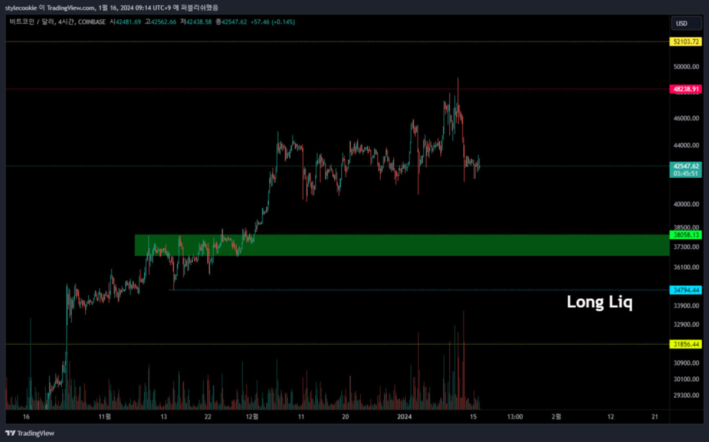 BTC에 대한 이야기로 넘어가봅시다. BTC는 ETF 승인후 실제 거래개시전에 49k로 상승했지만 거래가 시작되고 빠르게 42k 수준으로 하락하였습니다. 최근 거래량 중 가장 높은 거래량이였습니다. Sell The News가 맞았던 걸지도 모르겠습니다. BTC 가격이 급격하게 하락하기 시작한 원인으로는 GBTC 유출과 관련한 매도압력이 영향을 주었을 것이라고 저는 추측하고 있습니다. 또한 이익을 확보하기 위한 시장의 움직임.