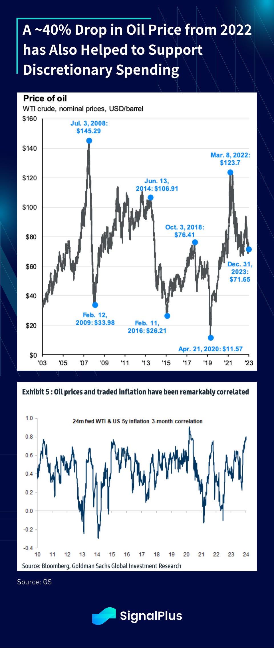 Furthermore, a ~40% drop in WTI crude from the March 2022 peak gave consumers yet another powerful boost to their spending budget, with oil prices retaining their elevated correlation to inflation expectations.