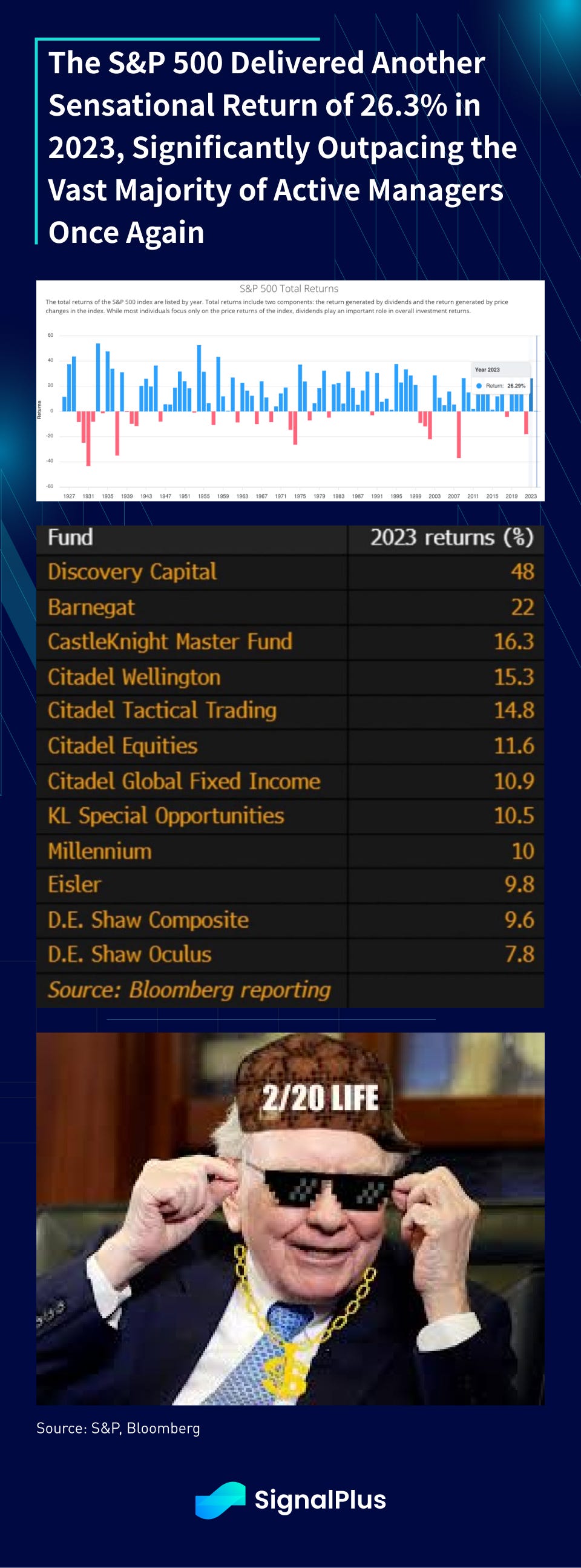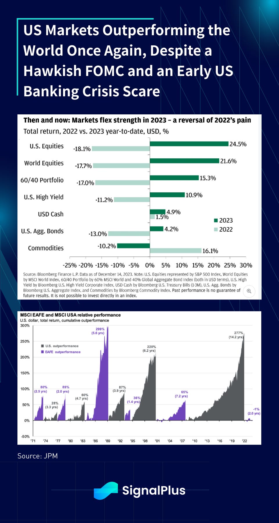 If you felt that way, the joke is on you. Instead, we saw the S&P return a remarkable 26.3% in 2023, the Nasdaq returning a whooping 54%, 10yr yields ending 2023 basically unchanged at 3.8% despite overnight rates spiking by +100bp. Active managers significantly underperforming indices again (what else is new), and US equities once again outperforming everyone else in the world.