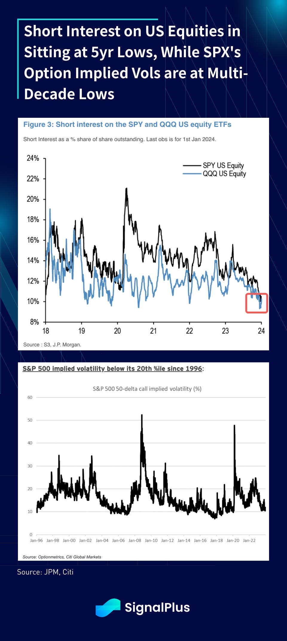 Furthermore, short interest on listed SPY and QQQ ETFs are sitting at some of the lowest levels over the past 5 years, and S&P 500’s option implied volatility has cracked underneath its 20%-percentile going back 30 years.