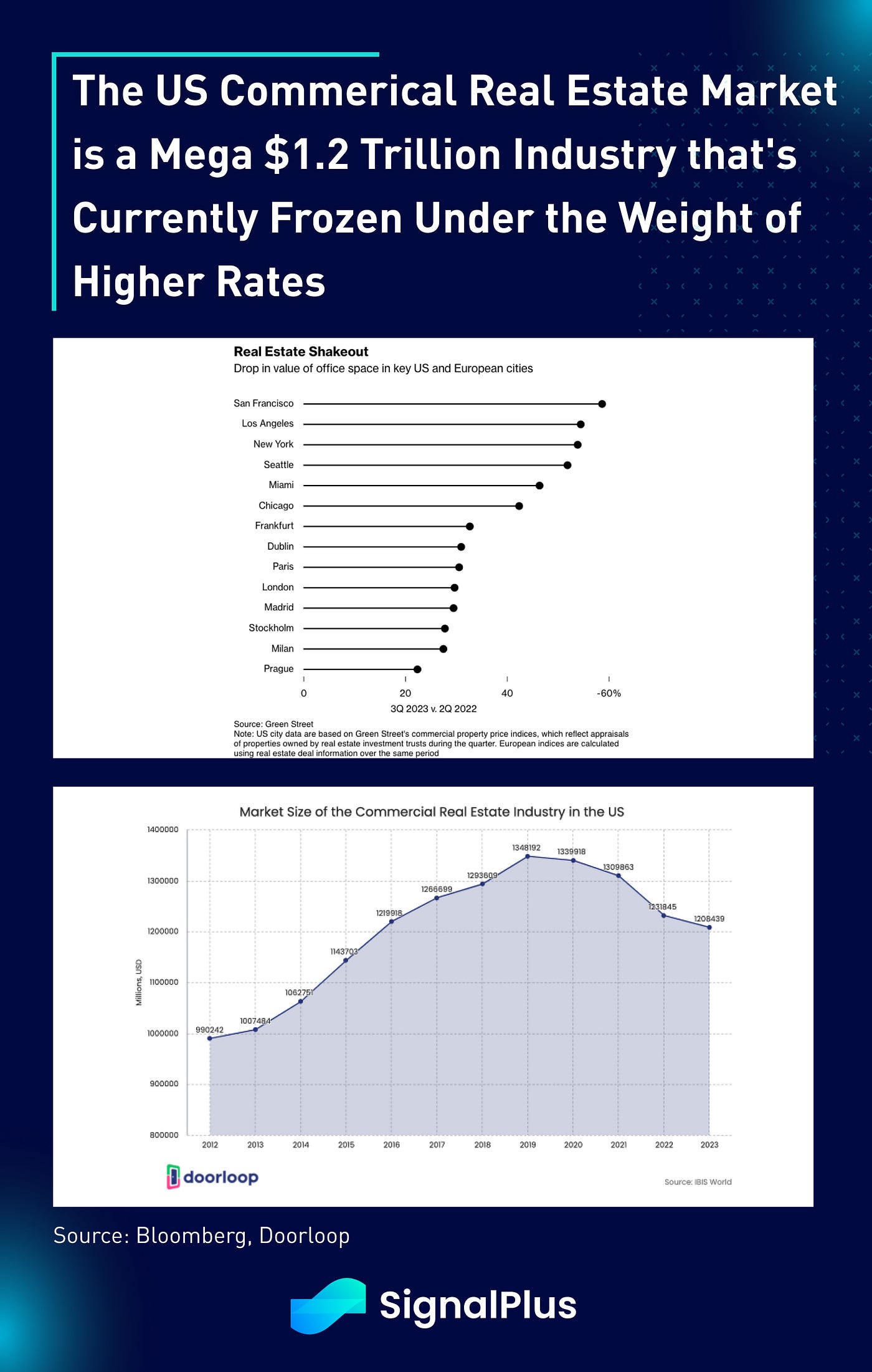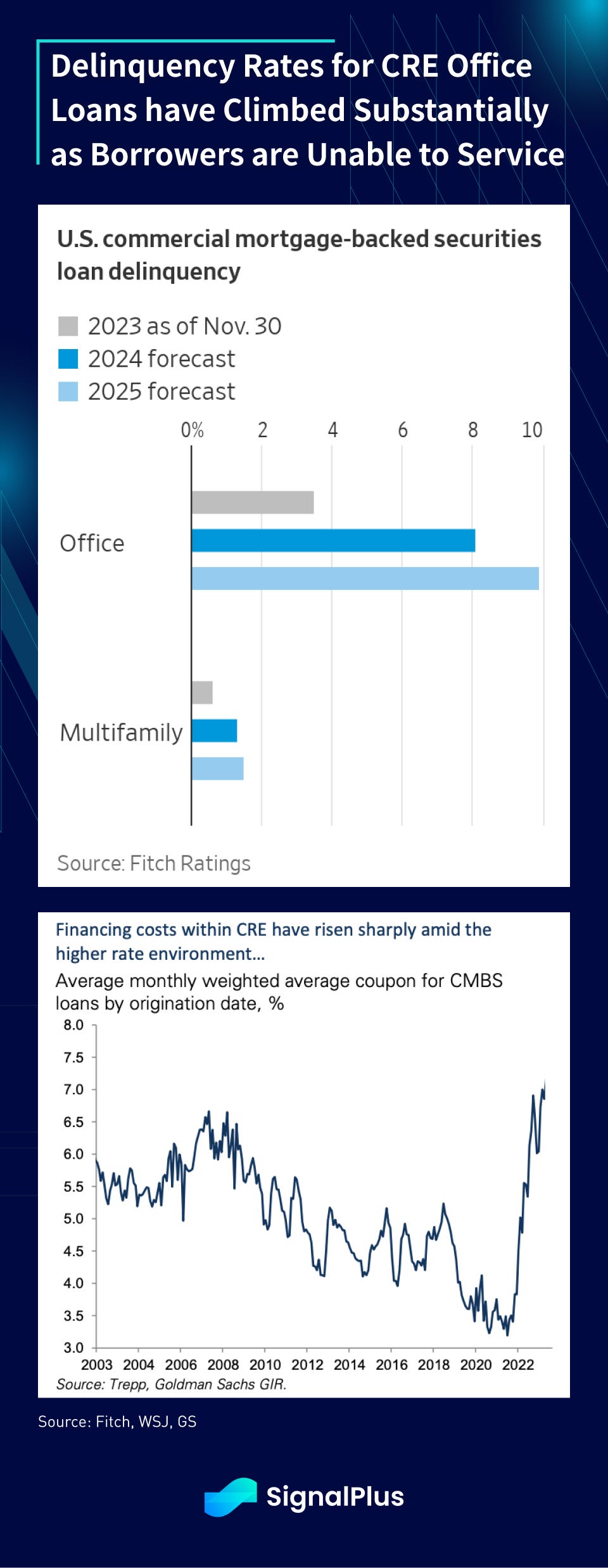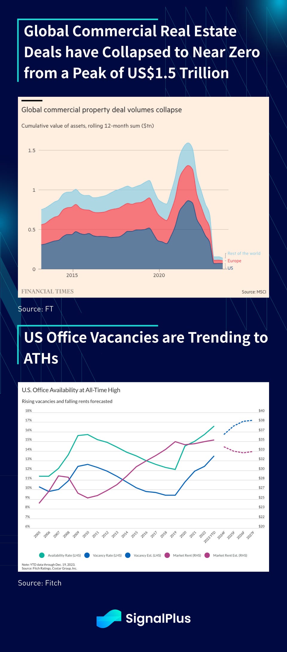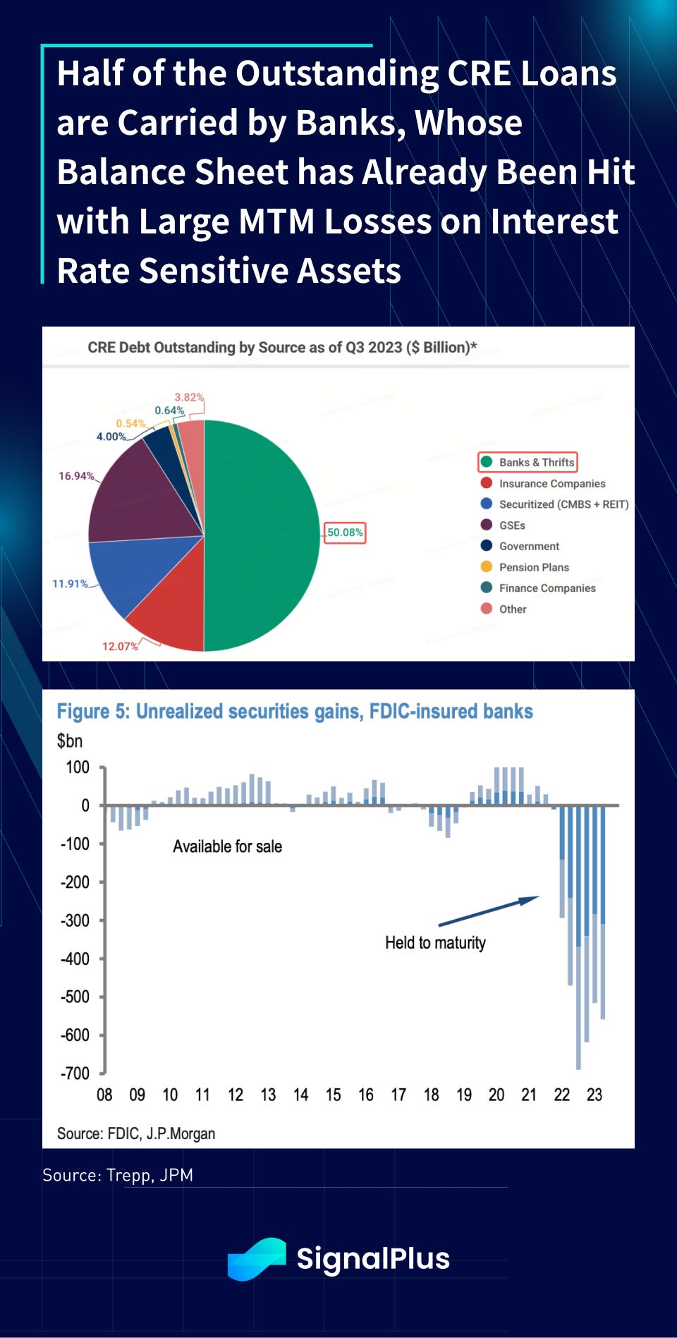 The steadfastness in rate hikes led to significant losses in interest rate-sensitive assets, such as mortgage-backed bonds and underlying real estate assets. In particular, we saw significant revaluations of the entire commercial real estate (CRE) sector, with deal activity in deep freeze territory, and many US gateway cities seeing office prices fall by 50% or more in 2023.