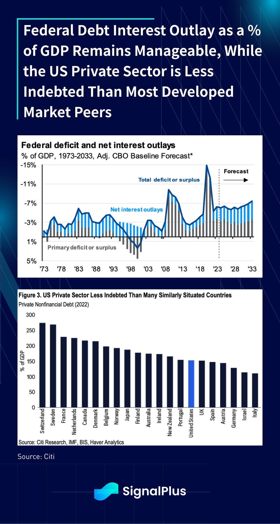 However, on a debt-coverage basis, interest outlays as a % of GDP remains manageable at around -6%, significantly below covid levels (-13% to -15%) and even the GFC (-8% to -10%). Furthermore, with US consumers diligently paying down debt, the US private sector is actually in much better financial shape than most developed market peers.