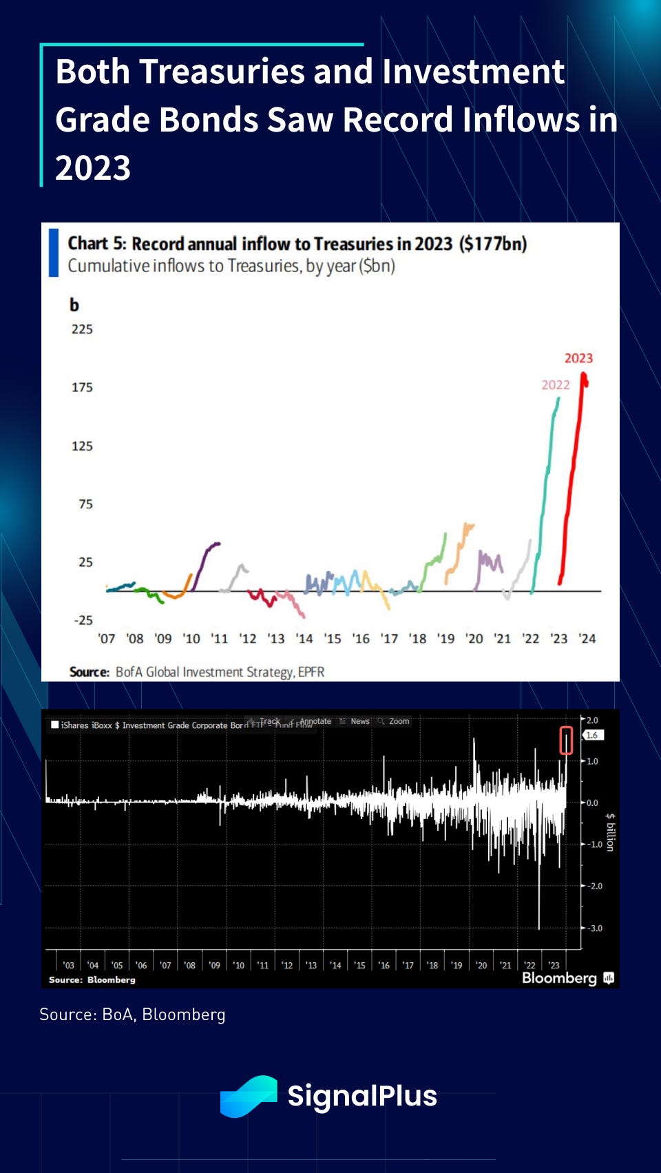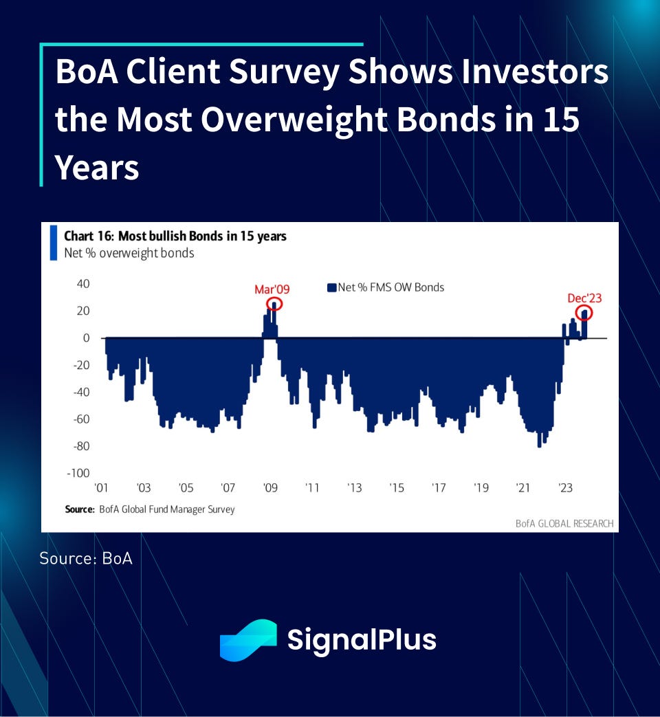 Investor optimism isn’t contained to just equities, with fixed income and corporate bonds seeing record inflows in 2023, as well as aggressive client long positioning into the new year.