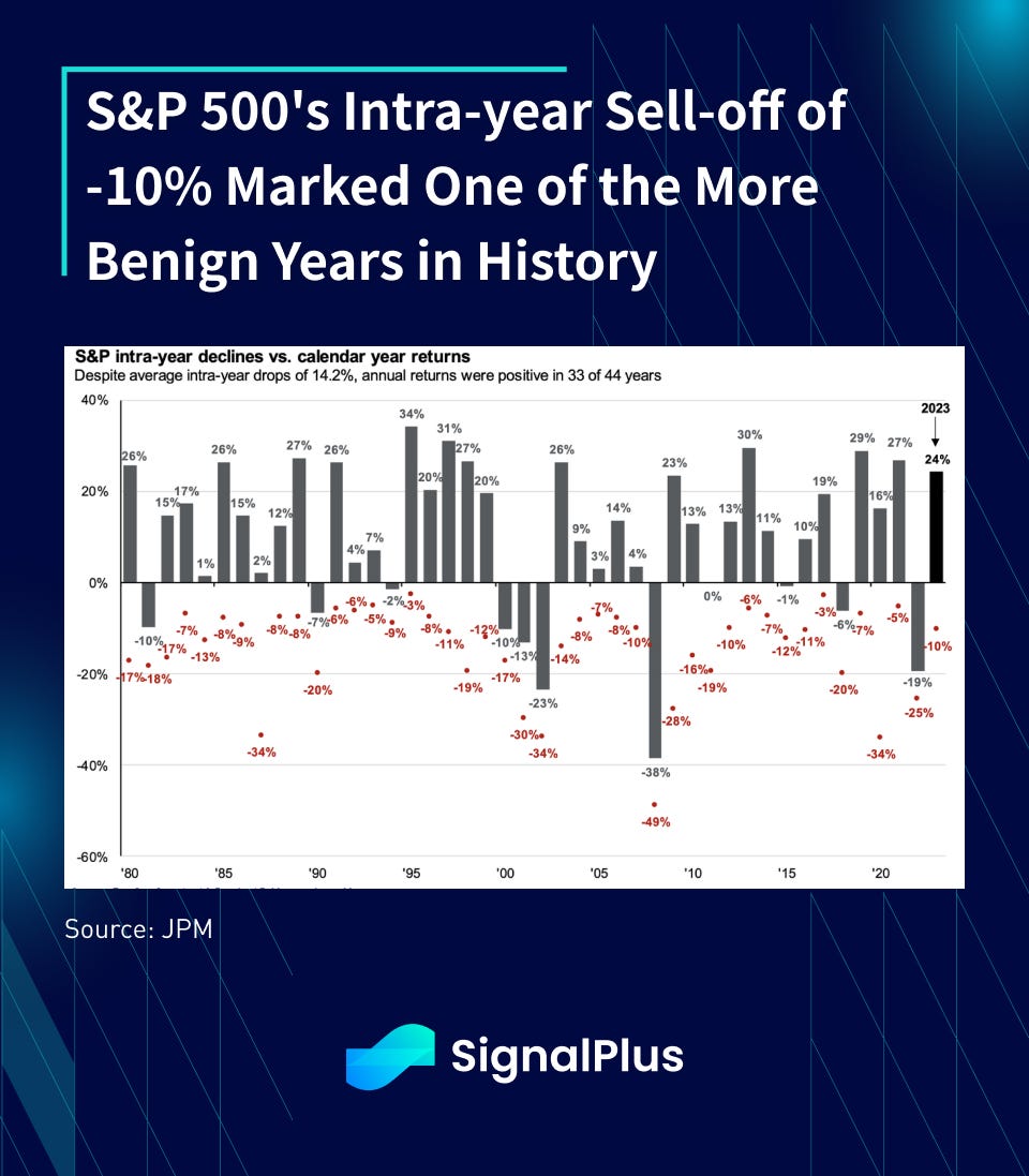 SPX P/E multiples had richened, but not quite to extreme levels and largely concentrated to the top megacap names (the ‘magnificient 7’). Furthermore, valuation never quite got so stretched to be ‘bubble-like’, with 2023’s intra-year sell-off of -10% much more benign than the average of the past 40 years.