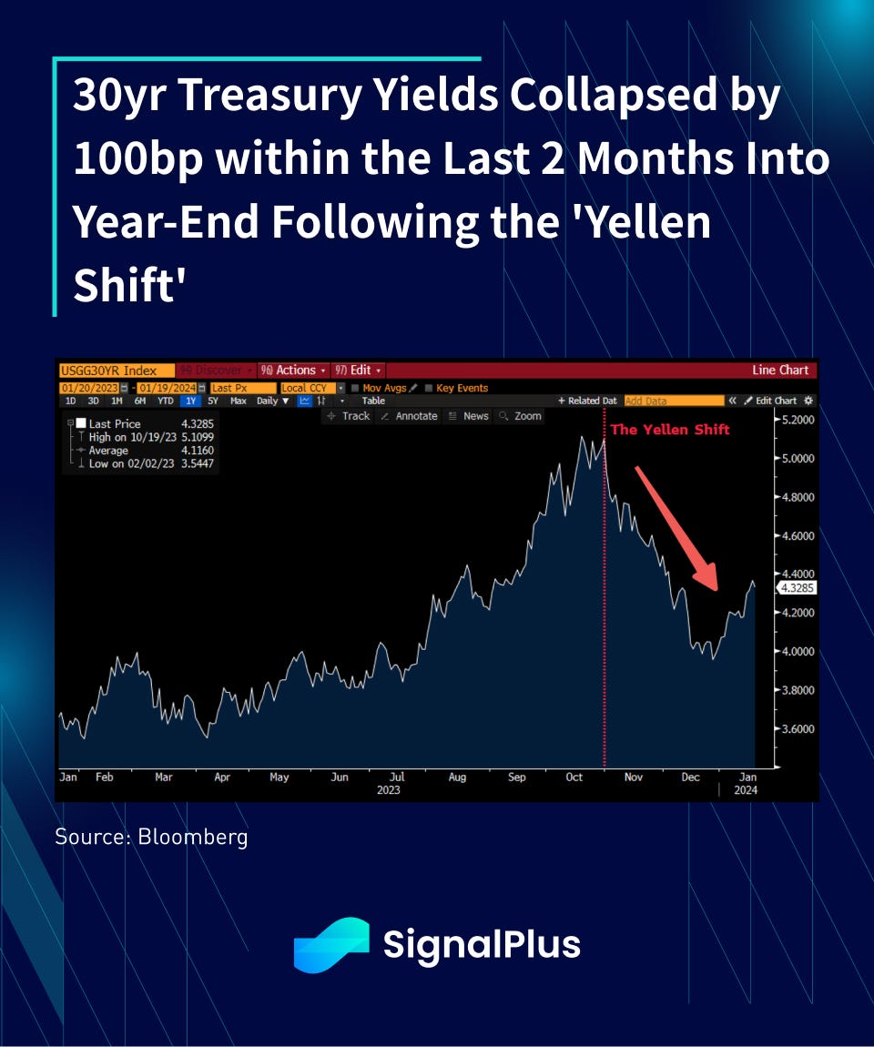 With that being said, the net marginal supply of government bonds is increasing over time, with the central banks QT (tightening) programs adding further to the selling pressure in 2024. As such, there is now a growing and acute focus on the Treasury’s quarterly refunding announcements (QRA), the last one of which had catalyzed the year-end risk rally which we highlighted in the sections above.