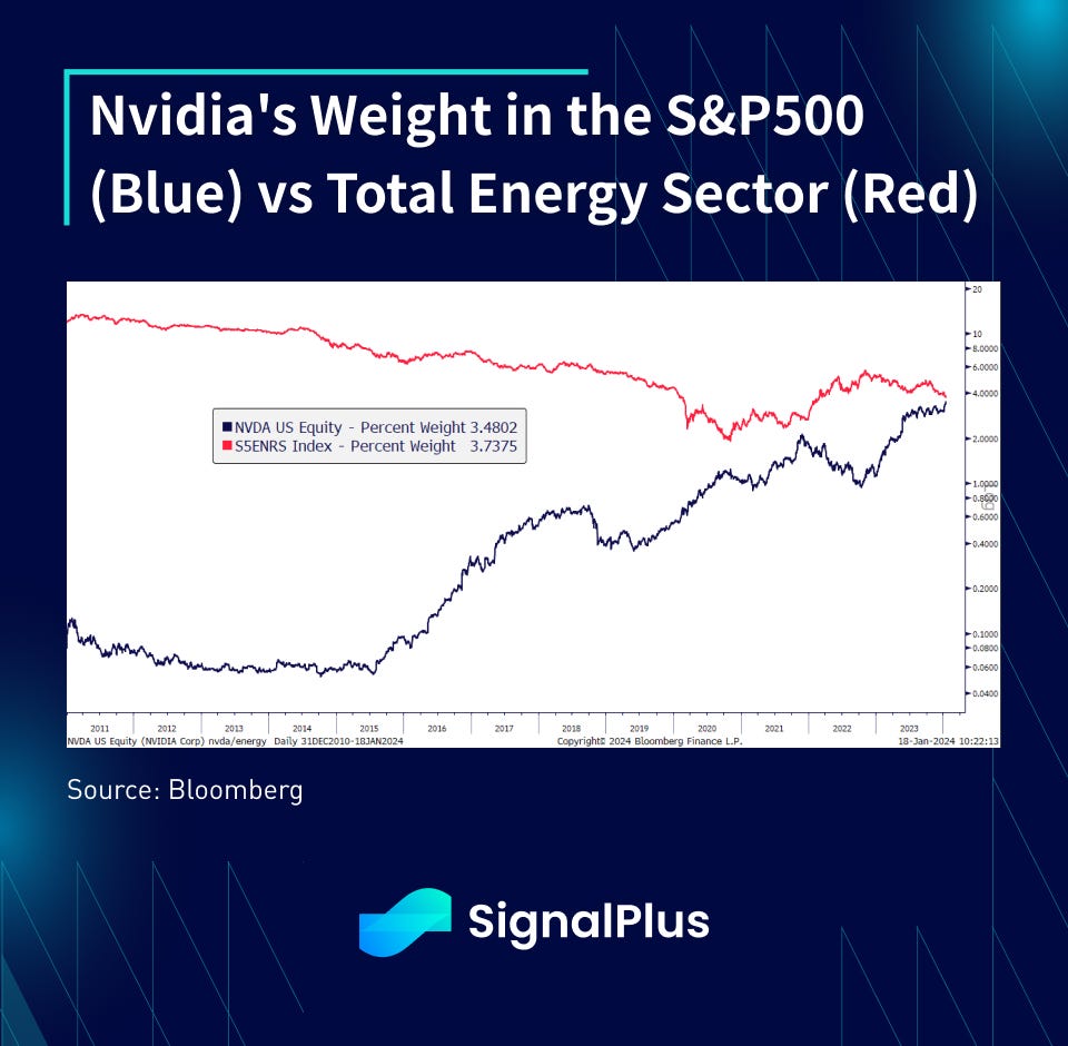 - Nvidia now has almost as large of a weight in the S&P500 index as the entire energy sector combined.