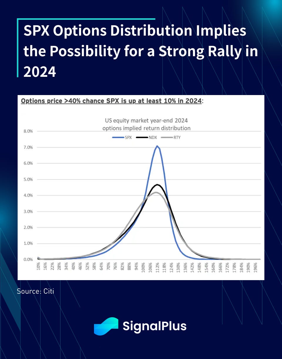 Option implied distribution implies a significant chance that the SPX will rally by more than 10% in 2024, while Citi’s ‘POLLS’ (Positioning, Optimism, Liquidity, Leverage, Stress) index is flashing signs of over-complacency consistent with previous interim highs.