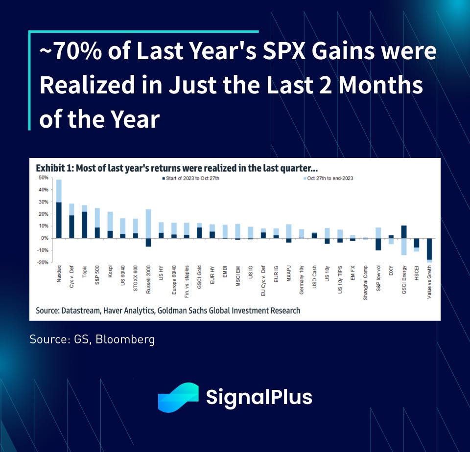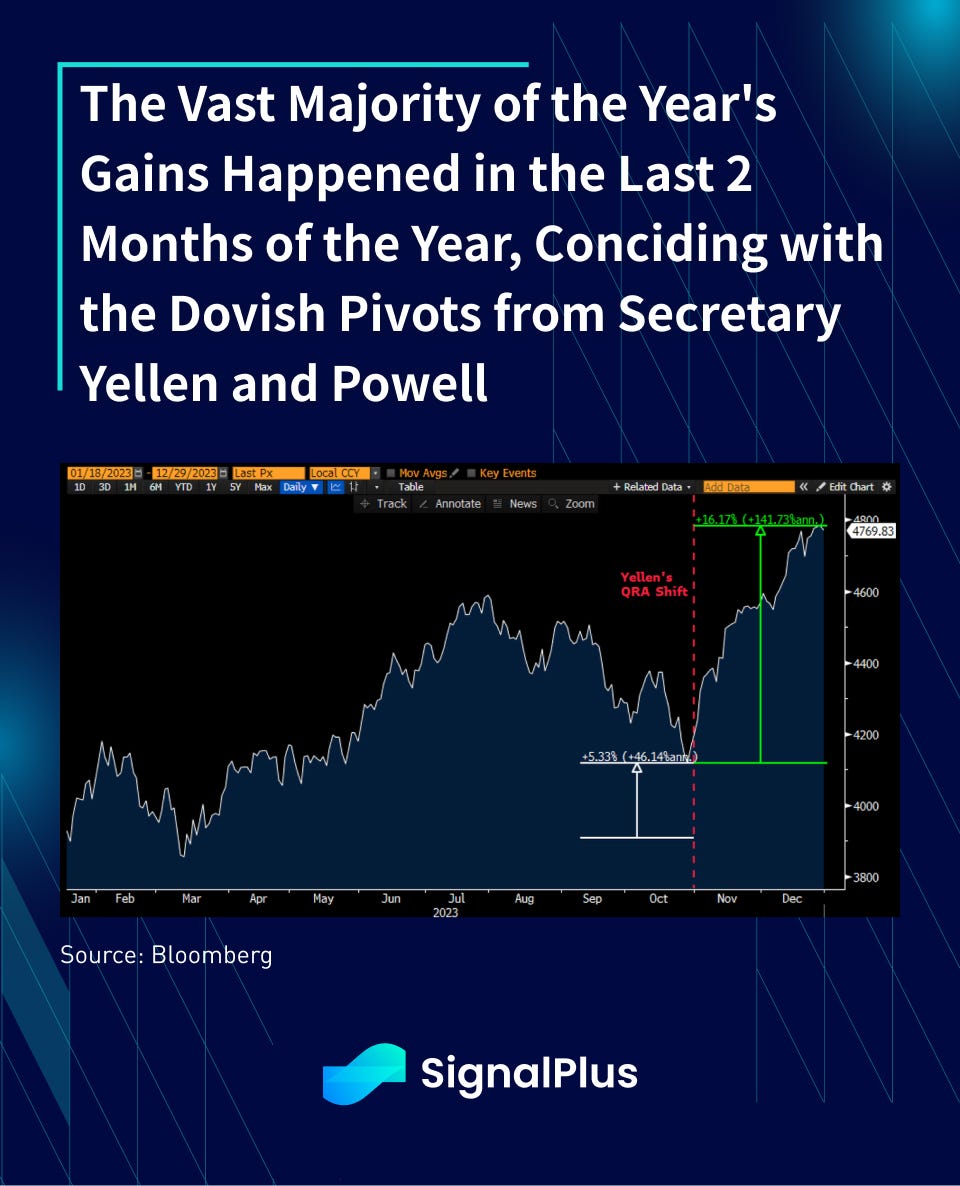 As with everything in life, timing is everything. Despite everything that has been covered, the lion’s share of the year’s gains happened in the last 2 months of the year, effectively coinciding with Yellen’s QRA shift in November, and further punctuated by Powell’s dovish pivot before year-end.